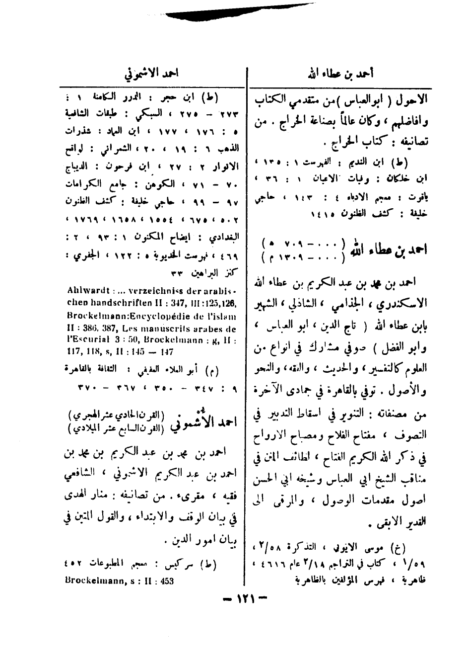 (ط) ابن النديم: الفهرست 1: 135، ابن خلكان: وفيات الاعيان 1: 36، ياقوت: معجم الادباء 4: 143، حاجي خليفة: كشف الظنون 1415 احمد بن عطاء الله (000 - 709 هـ) (000 - 1309 م) احمد بن محمد بن عبد الكريم بن عطاء الله الاسكندري، الجذامي، الشاذلي، الشهير بابن عطاء الله (تاج الدين، أبو العباس، وابو الفضل) صوفي مشارك في انواع من العلوم كالتفسير، والحديث، والفقه، والنحو والاصول.
