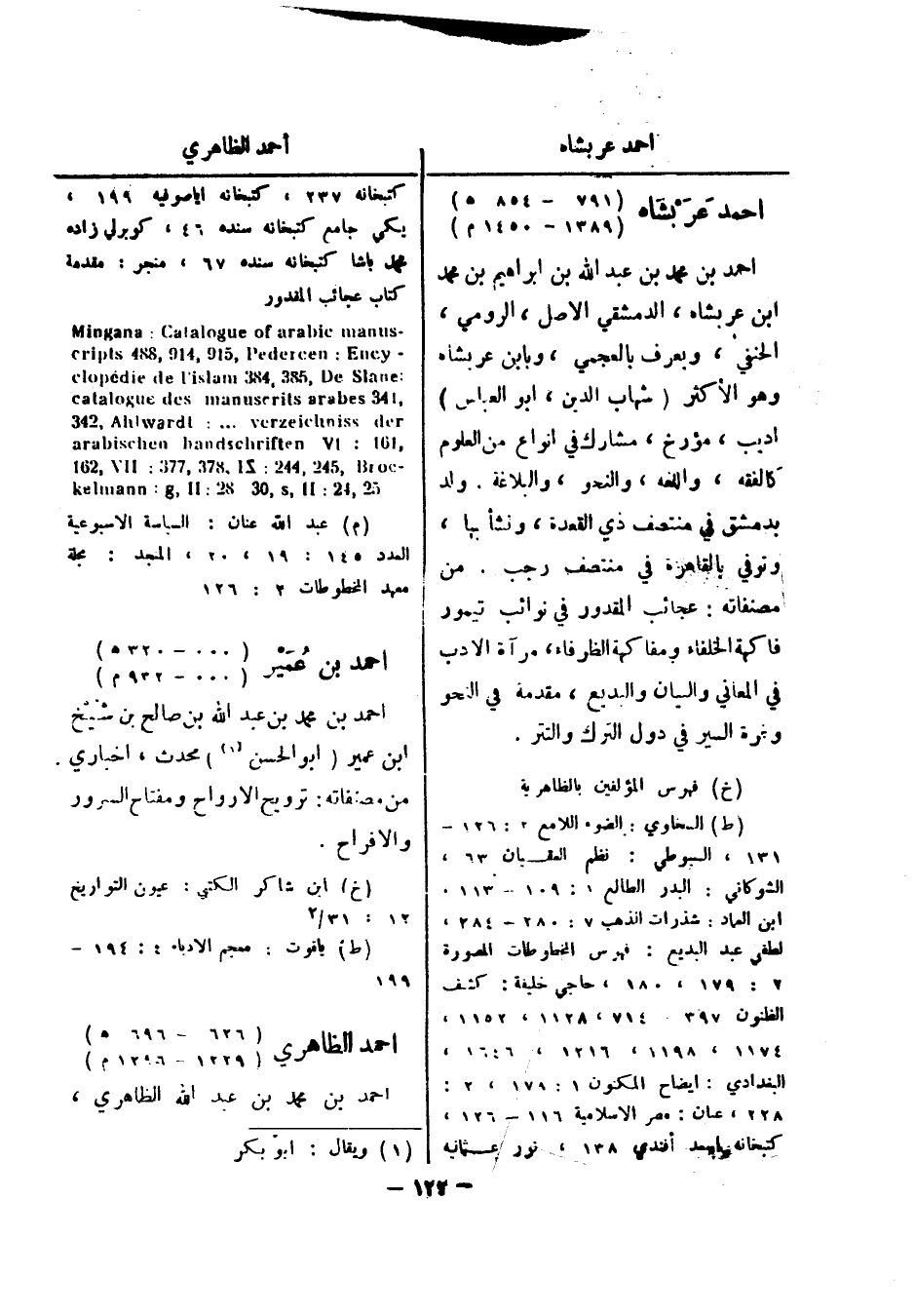 ابن العماد: شذرات الذهب 7: 280 - 284، لطفي عبد البديع: فهرس المخطوطات المصورة 2: 179، 180، حاجي خليفة: كشف الظنون 397، 714، 1128، 1152، 1174، 1198، 1216، 1646، البغدادي: ايضاح المكنون 1: 178، 2: 228، عيان: مصر الاسلامية 116 - 126، كتبخانه اسعد أفندي 138، نور عثمانيه كتبخانه 237، كتبخانه ايا صوفيه 199، يكي جامع كتبخانه سنده 46، كوبرلي زاده محمد باشا كتبخانه سنده 67، منجر: مقدمة كتاب عجائب المقدور: cripts 884 , 419 , 519 , Pedrecen - Mingana: Catalogue of arabic manus catalogue des manuscrits: clopedie de l ' islam 483 , 583 , De Slane - arabischen Ency 243 , Ahlwardt: ... verzeichniss der , 341 arabes - 261 , VII: 773 , 873.