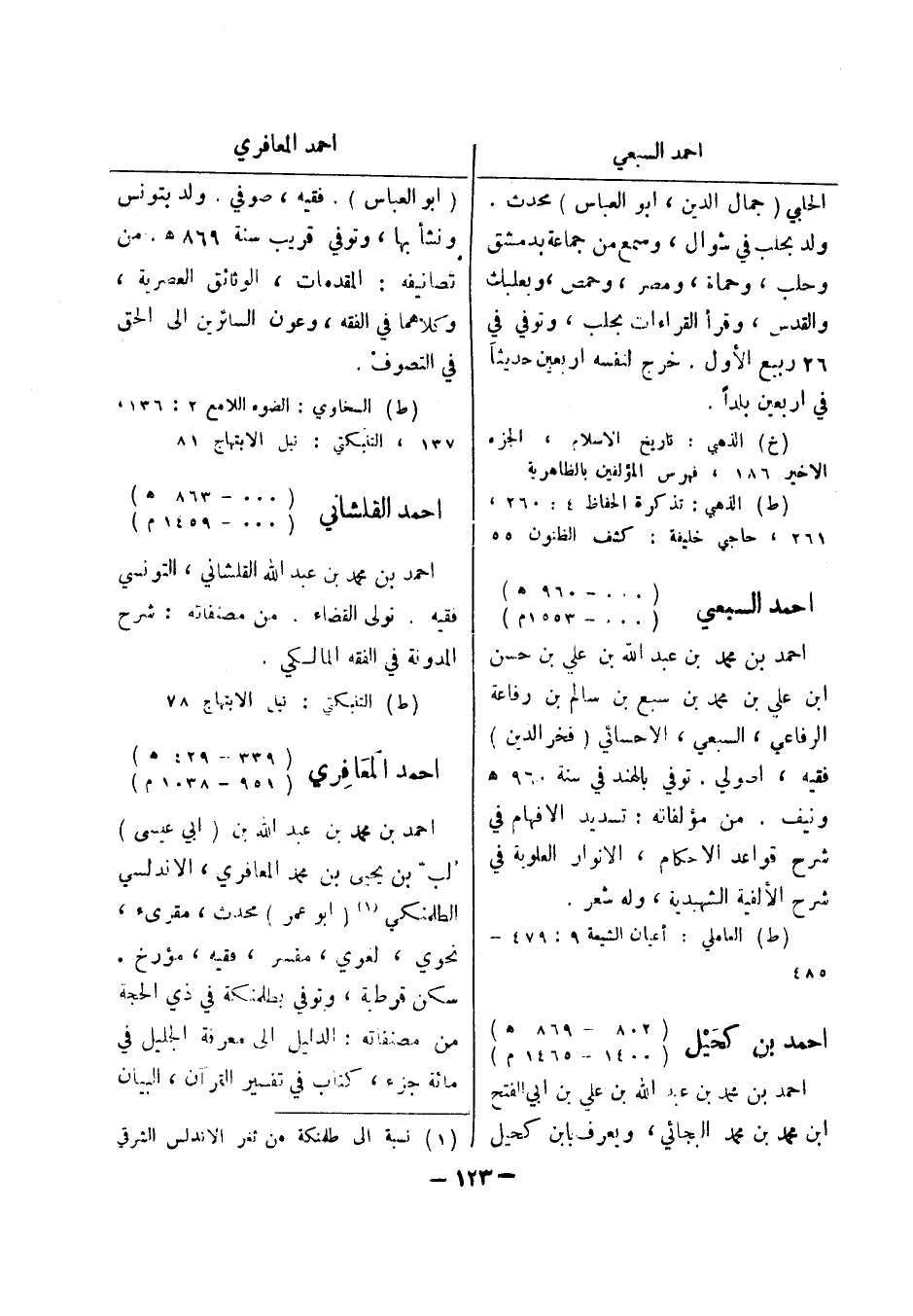 (ط) السخاوي: الضوء اللامع 2: 136، 137، التنبكتي: نيل الابتهاج 81 احمد القلشاني (000 - 863 هـ) (000 - 1459 م) احمد بن محمد بن عبد الله القلشاني، التونسي فقيه.