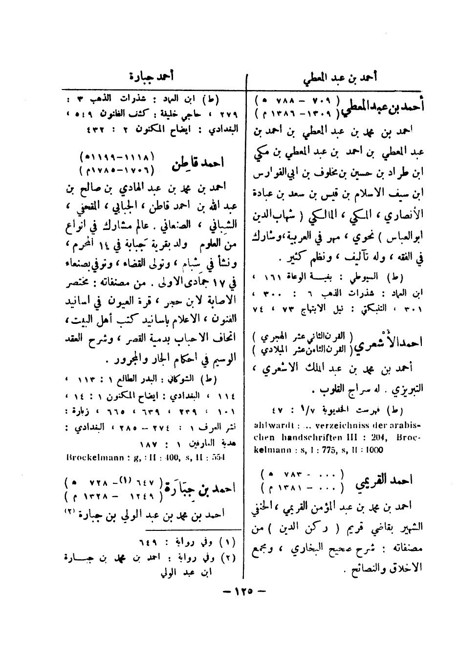 (ط) ابن العماد: شذرات الذهب 3: 279، حاجي خليفة: كشف الظنون 549، البغدادي: ايضاح المكنون 2: 432 احمد قاطن (1118 - 1199 هـ) (1706 - 1785 م) احمد بن محمد بن عبد الهادي بن صالح بن عبد الله بن احمد قاطن، الجبابي، المقحفي، الشباني، الصنعاني، عالم مشارك في انواع من العلوم ولد بقرية جبابة في 14 المحرم ونشأ في شبام.