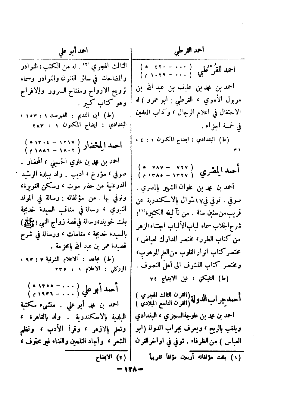 (ط) ابن النديم: الفهرست 1: 153، البغدادي: ايضاح المكنون 1: 283 احمد المحضار (1217 - 1304 هـ) (1802 - 1886 م) احمد بن محمد بن علوي الحسيني، المحضار.