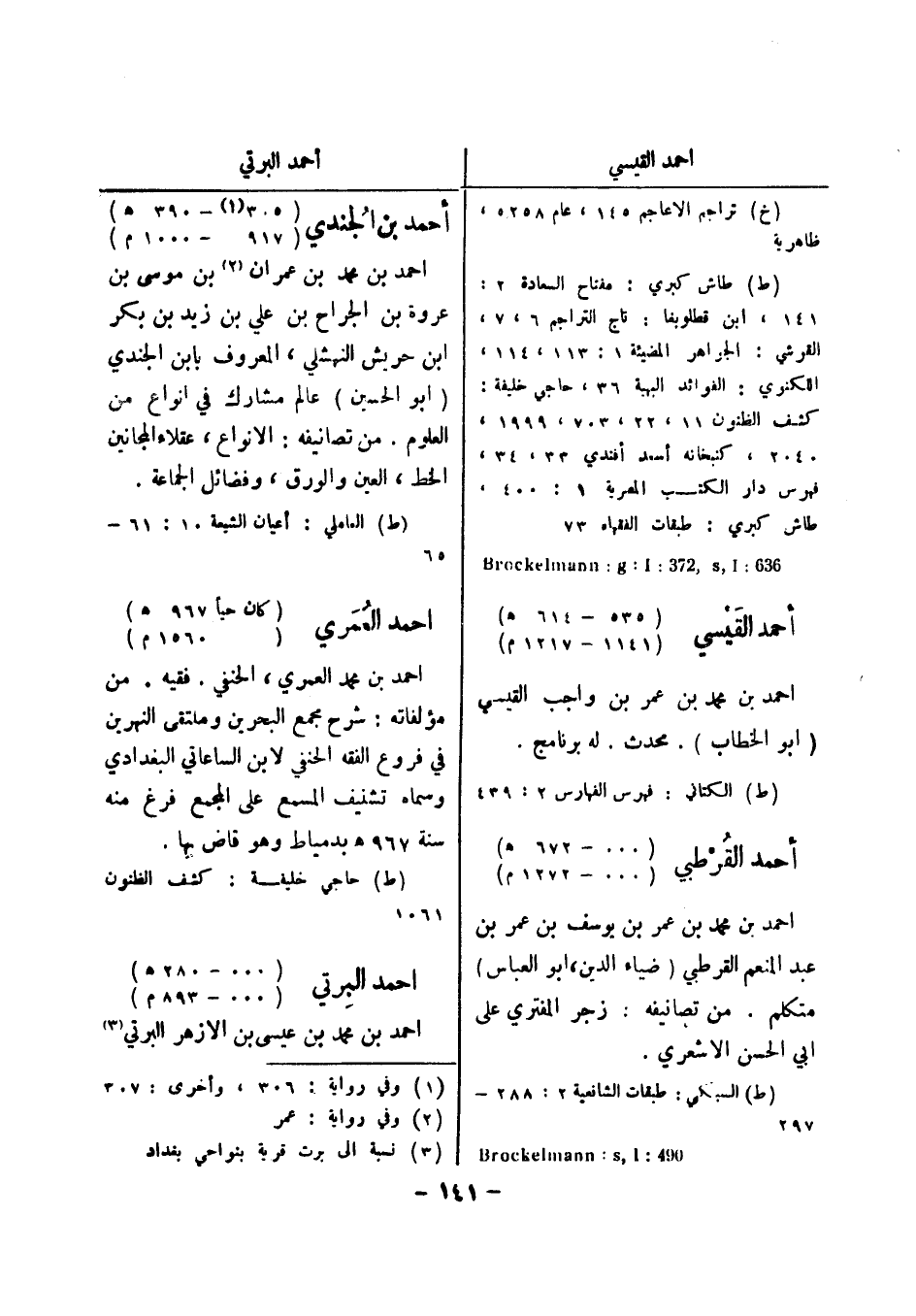 (خ) تراجم الاعاجم 145، عام 5258، ظاهرية (ط) طاش كبري: مفتاح السعادة 2: 141، ابن قطلوبغا: تاج التراجم 6، 7، القرشي: الجواهر المضيئة 1: 113، 114، اللكنوي: الفوائد البهية 36، حاجي خليفة: كشف الظنون 11، 22، 703، 1999، 2040، كتبخانه أسعد أفندي 33، 34، فهرس دار الكتب المصرية 1: 400، طاش كبري: طبقات الفقهاء 73 636: Brockelmann: g: I: 273 , s , I أحمد القيسي (535 - 614 هـ) (1141 - 1217 م)