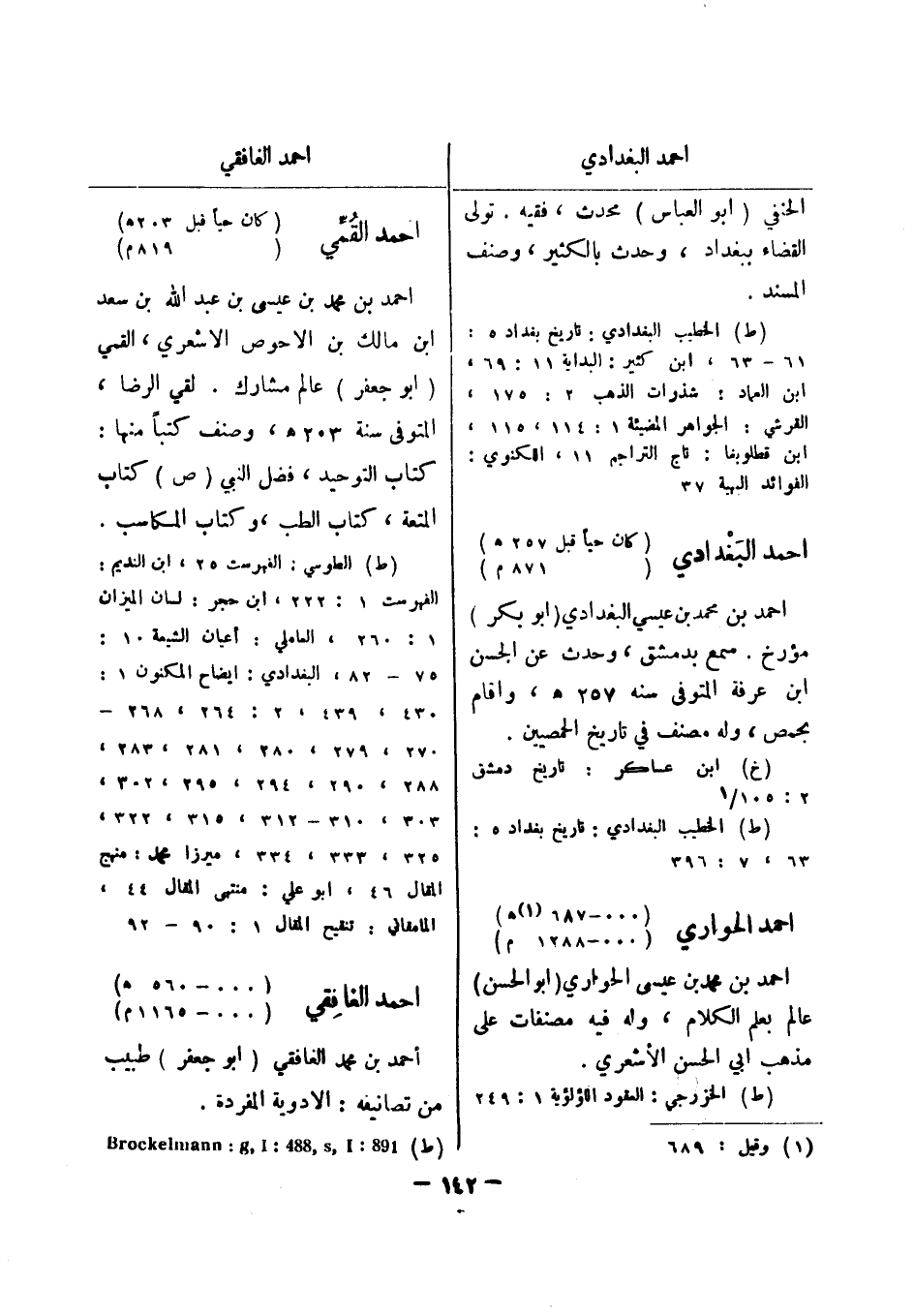 القرشي: الجواهر المضيئة 1: 114، 115، ابن قطلوبغا: تاج التراجم 11، اللكنوي: الفوائد البهية 37 احمد البغدادي (كان حيا قبل 257 هـ) (871 م) احمد بن محمد بن عيسي البغدادي (أبو بكر) مؤرخ.