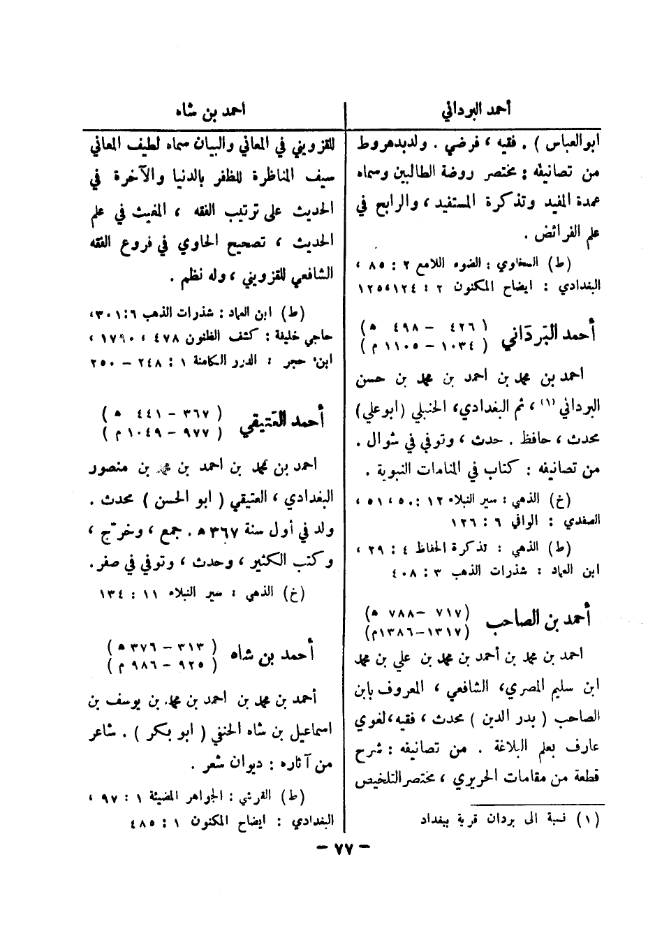 (ط) السخاوي: الضوء اللامع 2: 85، البغدادي: ايضاح المكنون 2: 124، 125 أحمد البرداني (426 - 498 هـ) (1034 - 1105 م) احمد بن محمد بن احمد بن محمد بن حسن البرداني (1) ، ثم البغدادي، الحنبلي (أبو علي) محدث، حافظ.