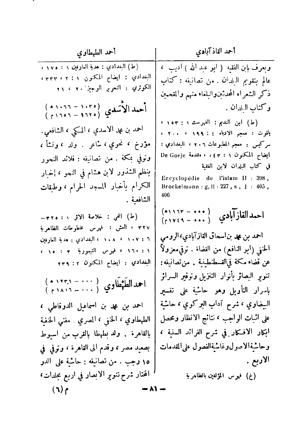 (ط) ابن النديم: الفهرست 1: 153، ياقوت: معجم الادباء 4: 199، 200، سر كيس: معجم المطبوعات 206، البغدادي: ايضاح المكنون 1: 543، مقدمة De Goeje في كتاب البلدان لابن الفقية Brockelmann: g , II , 722 , s , 398: Encyclopedie de l 604 ' islam II , 405: , I احمد القاز آبادي (000 - 1163 هـ) (000 - 1749 م) احمد بن محمد بن اسحاق القاز آبادي، الرومي الحنفي (أبو النافع) من القضاة.