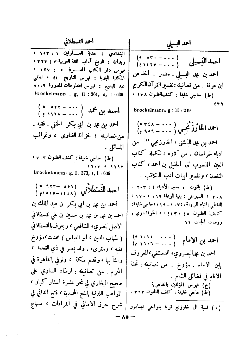 (ط) حاجي خليفة: كشف الظنون 703، 1197، 1603 639: Brockelmann: g , I: 373 , s , I احمد القسطلاني (851 - 923 هـ) (1448 - 1517 م) أحمد بن محمد بن ابي بكر بن عبد المك بن احمد بن محمد بن محمد بن حسين بن علي القسطلاني الاصل المصري، الشافعي، ويعرف بالقسطلاني (شهاب الدين، أبو العباس) محدث، مؤرخ فقيه، ومقرئ.