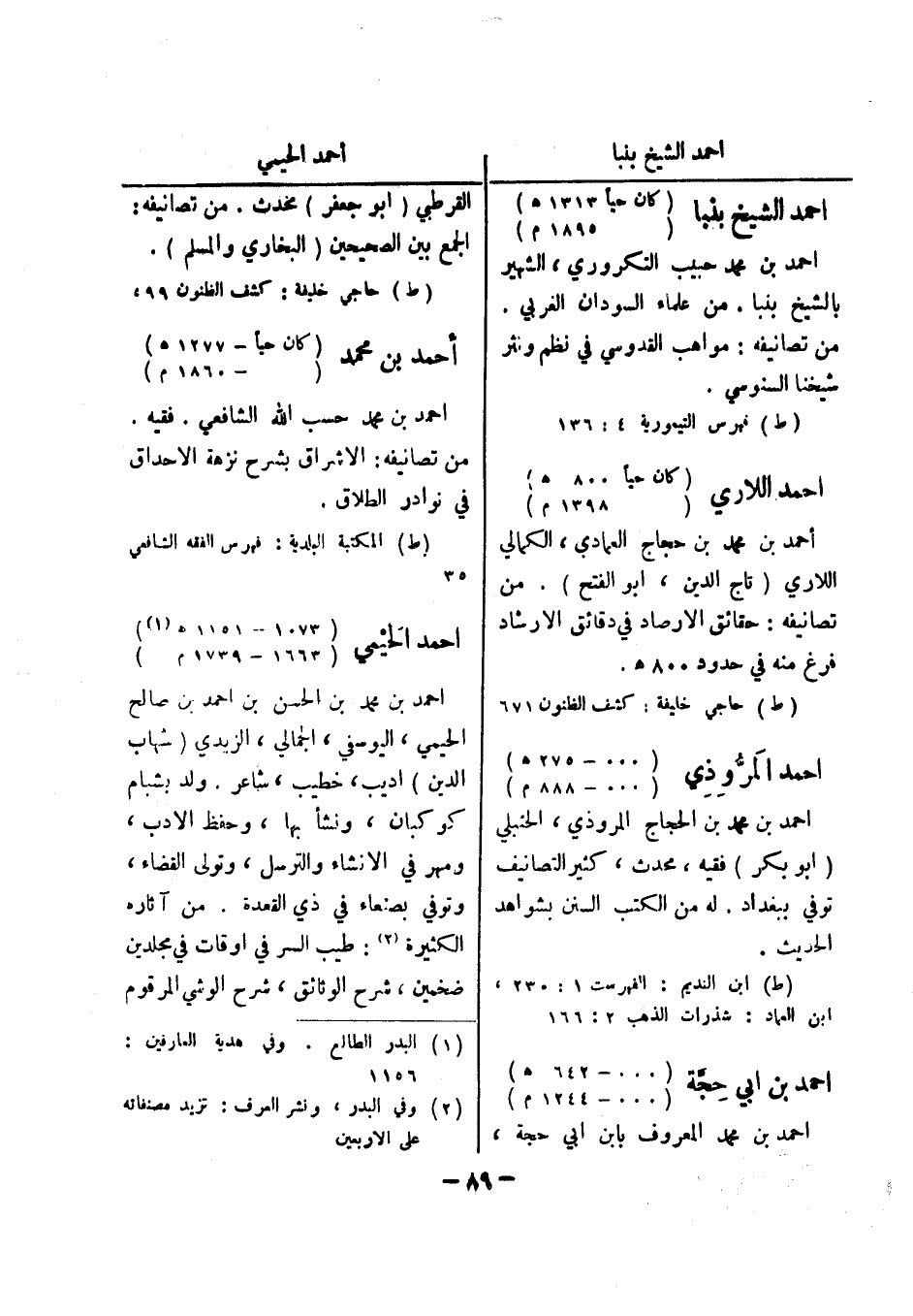 (ط) حاجي خليفة: كشف الظنون 99، أحمد بن محمد (كان حيا - 1277 هـ) (- 1860 م) احمد بن محمد حسب الله الشافعي.