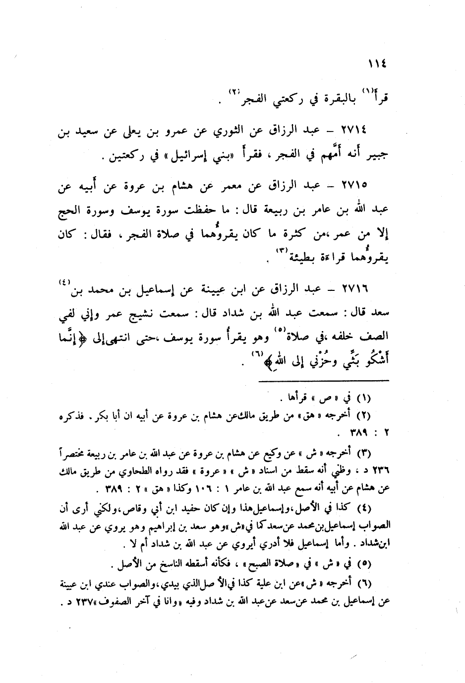 ٢٧١٥ - عَنْ مَعْمَرٍ، عَنْ هِشَامِ بْنِ عُرْوَةَ، عَنْ أَبِيهِ، عَنْ عَبْدِ اللَّهِ بْنِ عَامِرِ بْنِ رَبِيعَةَ قَالَ: «مَا حَفِظْتُ سُورَةَ يُوسُفَ، وَسُورَةَ الْحَجِّ إِلَّا مِنْ عُمَرَ مِنْ كَثْرَةِ مَا كَانَ يَقْرَؤُهُمَا فِي صَلَاةِ الْفَجْرِ»، فَقَالَ: «كَانَ يَقْرَؤُهُمَا قِرَاءَةً بَطِيئَةً»