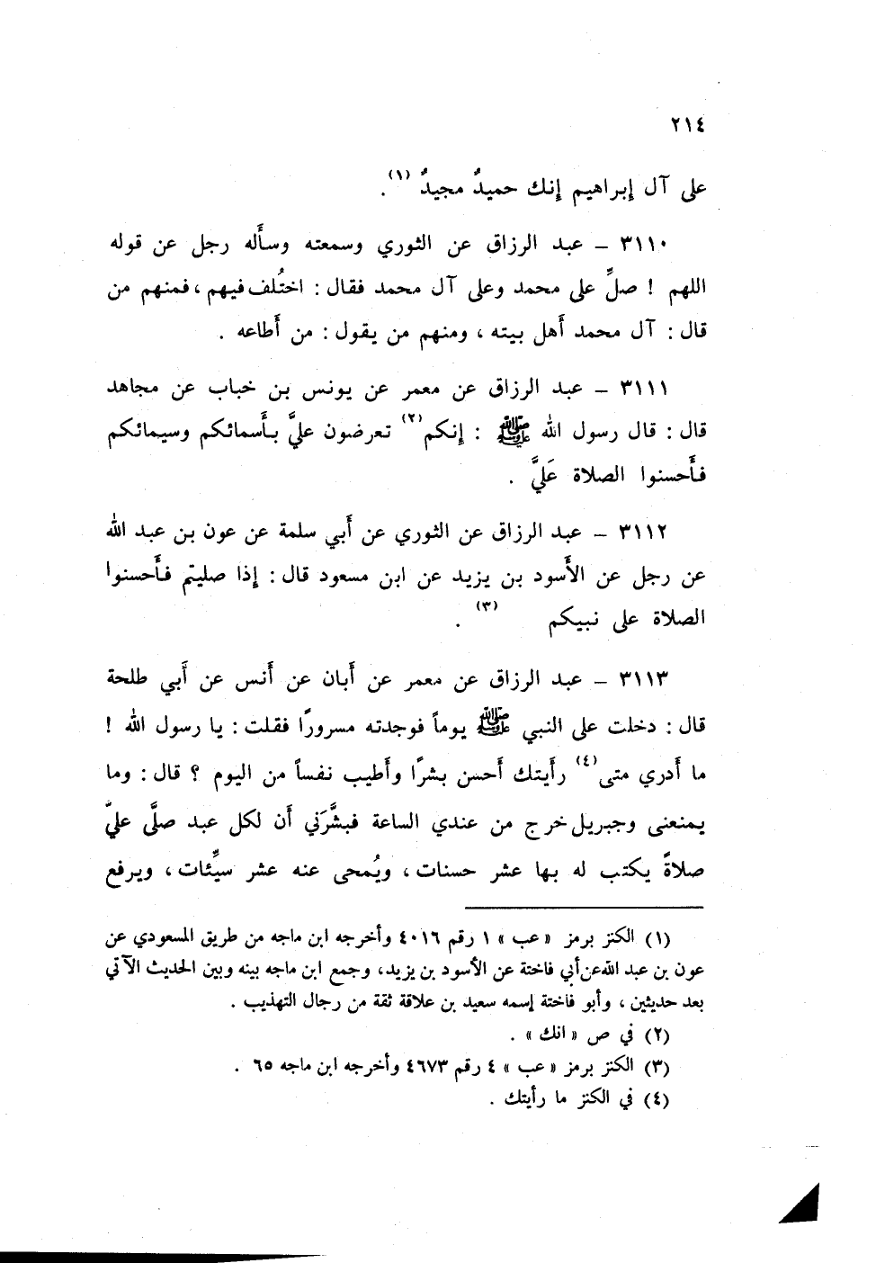 ٣١١٣ - عَنْ مَعْمَرٍ، عَنْ أَبَانَ، عَنْ أَنَسٍ، عَنْ أَبِي طَلْحَةَ قَالَ: دَخَلْتُ عَلَى النَّبِيِّ صَلَّى اللهُ عَلَيْهِ وَسَلَّمَ يَوْمًا فَوَجَدْتُهُ مَسْرُورًا، فَقُلْتُ: يَا رَسُولَ اللَّهِ، مَا أَدْرِي مَتَى رَأَيْتُكَ أَحْسَنَ بِشْرًا وَأَطْيَبَ نَفْسًا مِنَ الْيَوْمِ؟ قَالَ: «وَمَا يَمْنَعُنِي وَجِبْرِيلُ خَرَجَ مِنْ عِنْدِي السَّاعَةَ، فَبَشَّرَنِي أَنَّ لِكُلِّ عَبْدٍ صَلَّى عَلَيَّ صَلَاةً يُكْتَبُ لَهُ بِهَا عَشْرُ حَسَنَاتٍ، وَيُمْحَى عَنْهُ عَشْرُ سَيِّئَاتٍ، وَيُرْفَعُ لَهُ عَشْرُ دَرَجَاتٍ، وَتُعْرَضُ عَلَيَّ كَمَا قَالَهَا، وَيُرَدُّ عَلَيْهِ بِمِثْلِ مَا دَعَا»
