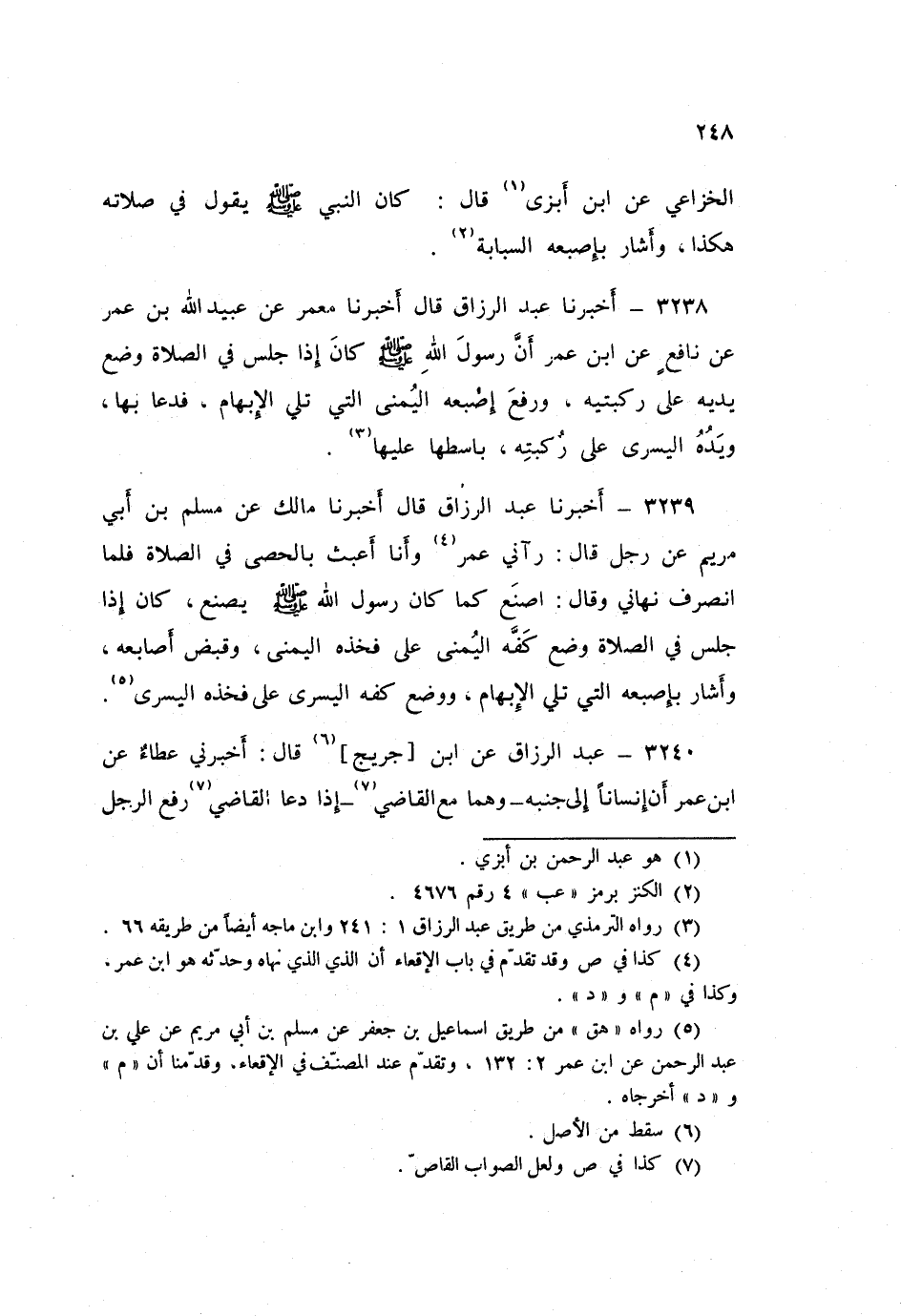 ٣٢٣٨ - عَبْدُ الرَّزَّاقِ، أَخْبَرَنَا مَعْمَرٌ، عَنْ عُبَيْدِ اللَّهِ بْنِ عُمَرَ، عَنْ نَافِعٍ، عَنِ ابْنِ عُمَرَ أَنَّ رَسُولَ اللَّهِ صَلَّى اللهُ عَلَيْهِ وَسَلَّمَ كَانَ إِذَا جَلَسَ فِي الصَّلَاةِ وَضَعَ يَدَيْهِ عَلَى رُكْبَتَيْهِ، وَرَفَعَ إِصْبَعَهُ الْيُمْنَى الَّتِي تَلِي الْإِبْهَامَ، فَدَعَا بِهِمَا، وَيَدُهُ الْيُسْرَى عَلَى رُكْبَتِهِ، بَاسِطُهَا عَلَيْهَا "