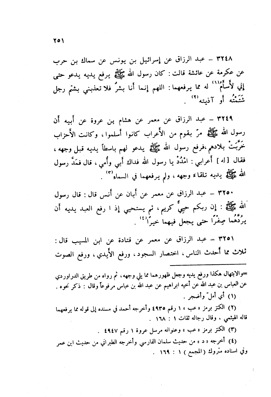 ٣٢٤٩ - عَنْ مَعْمَرٍ، عَنْ هِشَامِ بْنِ عُرْوَةَ، عَنْ أَبِيهِ، " أَنَّ رَسُولَ اللَّهِ صَلَّى اللهُ عَلَيْهِ وَسَلَّمَ مَرَّ بِقَوْمٍ مِنَ الْأَعْرَابِ كَانُوا أَسْلَمُوا، وَكَانْتِ الْأَحْزَابُ خَرَّبَتْ بِلَادَهُمْ، فَرَفَعَ رَسُولُ اللَّهِ صَلَّى اللهُ عَلَيْهِ وَسَلَّمَ يَدْعُو لَهُمْ بَاسِطًا يَدَيْهِ قِبَلَ وَجْهِهِ، فَقَالَ لَهُ أَعْرَابِيٌّ: امْدُدْ يَا رَسُولَ اللَّهِ فِدَاكَ أَبِي وَأُمِّي قَالَ: فَمَدَّ رَسُولُ اللَّهِ صَلَّى اللهُ عَلَيْهِ وَسَلَّمَ يَدَيْهِ تِلْقَاءَ وَجْهِهِ، وَلَمْ يَرْفَعْهُمَا فِي السَّمَاءِ "