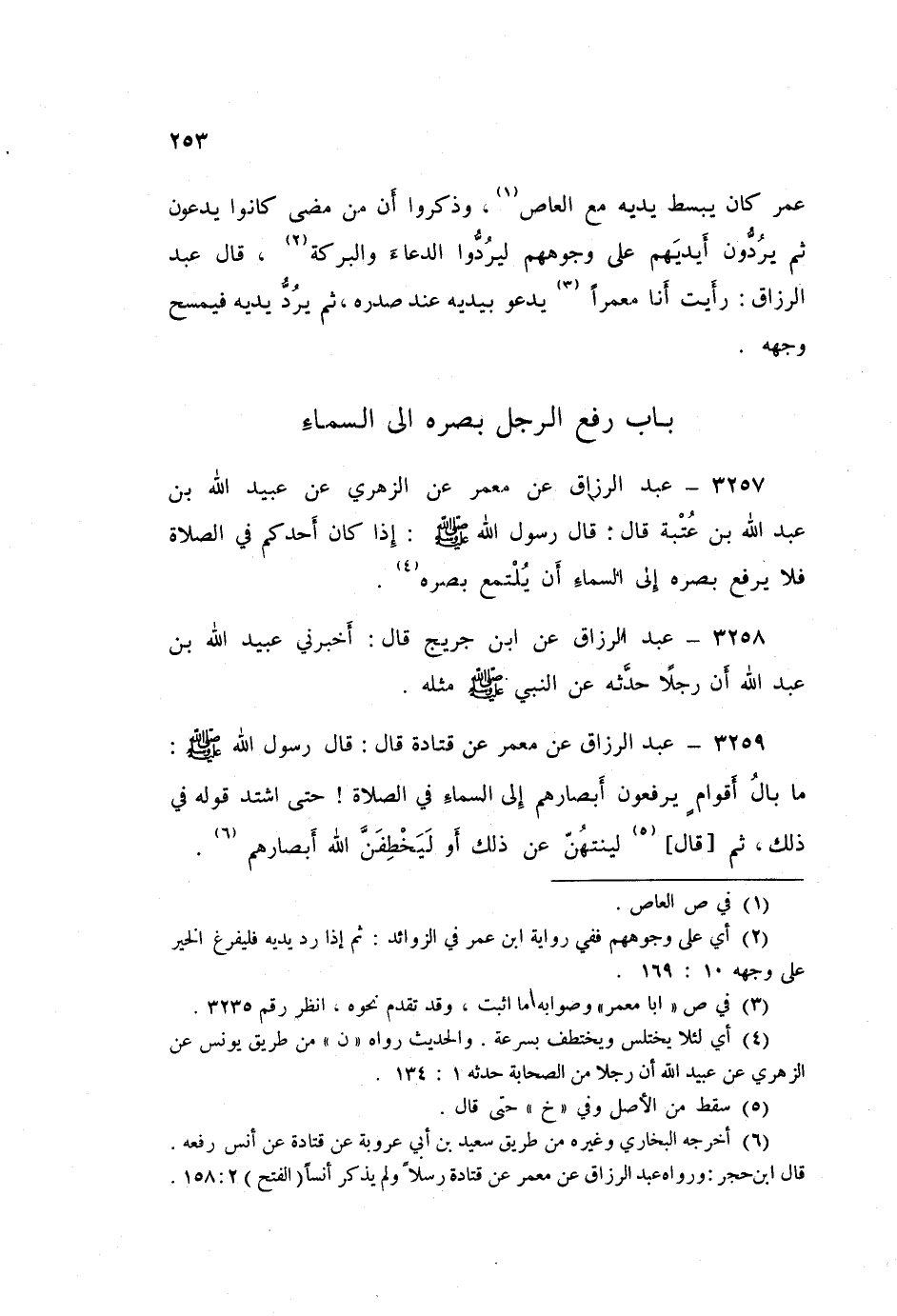 ٣٢٥٧ - عَنْ مَعْمَرٍ، عَنِ الزُّهْرِيِّ، عَنْ عُبَيْدِ اللَّهِ بْنِ عَبْدِ اللَّهِ بْنِ عُتْبَةَ قَالَ: قَالَ رَسُولُ اللَّهِ صَلَّى اللهُ عَلَيْهِ وَسَلَّمَ: «إِذَا كَانَ أَحَدُكُمْ فِي الصَّلَاةِ فَلَا يَرْفَعْ بَصَرَهُ إِلَى السَّمَاءِ أَنْ يُلْتَمَعَ بَصَرُهُ». عَبْدُ الرَّزَّاقِ،