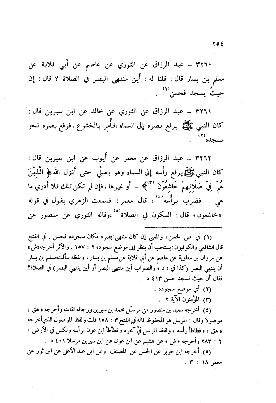 ٣٢٦٢ - عَنْ مَعْمَرٍ، عَنْ أَيُّوبَ، عَنِ ابْنِ سِيرِينَ قَالَ: " كَانَ النَّبِيُّ صَلَّى اللهُ عَلَيْهِ وَسَلَّمَ يَرْفَعُ رَأْسَهُ إِلَى السَّمَاءِ وَهُوَ يُصَلِّي حَتَّى أَنْزَلَ اللَّهُ: {الَّذِينَ هُمْ فِي صَلَاتِهِمْ خَاشِعُونَ} [المؤمنون: ٢]- أَوْ غَيْرَهَا، فَإِنْ لَمْ تَكُنْ تِلْكَ فَلَا أَدْرِي مَا هِيَ - فَضَرَبَ بِرَأْسِهِ " قَالَ مَعْمَرٌ: فَسَمِعْتُ الزُّهْرِيَّ يَقُولُ فِي قَوْلِهِ: {خَاشِعُونَ} [المؤمنون: ٢] قَالَ: «السُّكُونُ فِي الصَّلَاةِ» وَقَالَهُ الثَّوْرِيُّ، عَنْ مَنْصُورٍ، عَنْ مُجَاهِدٍ مِثْلَهُ