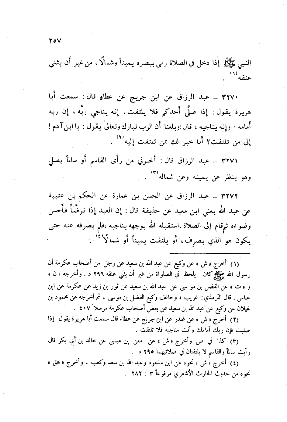 ٣٢٧١ - عَبْدُ الرَّزَّاقِ، أَخْبَرَنِي مَنْ، «رَأَى الْقَاسِمَ أَوْ سَالِمًا يُصَلِّي وَهُوَ يَنْظُرُ عَنْ يَمِينَهُ وَعَنْ شِمَالِهِ»