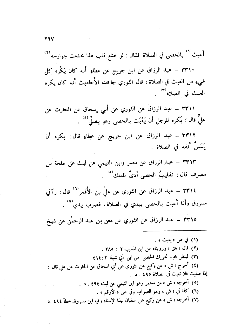 ٣٣١٣ - عَنْ مَعْمَرٍ، وَابْنِ التَّيْمِيِّ، عَنْ لَيْثٍ، عَنْ طَلْحَةَ بْنِ مُصَرِّفٍ قَالَ: «تَقْلِيبُ الْحَصَى أَذًى لِلْمَلِكِ»