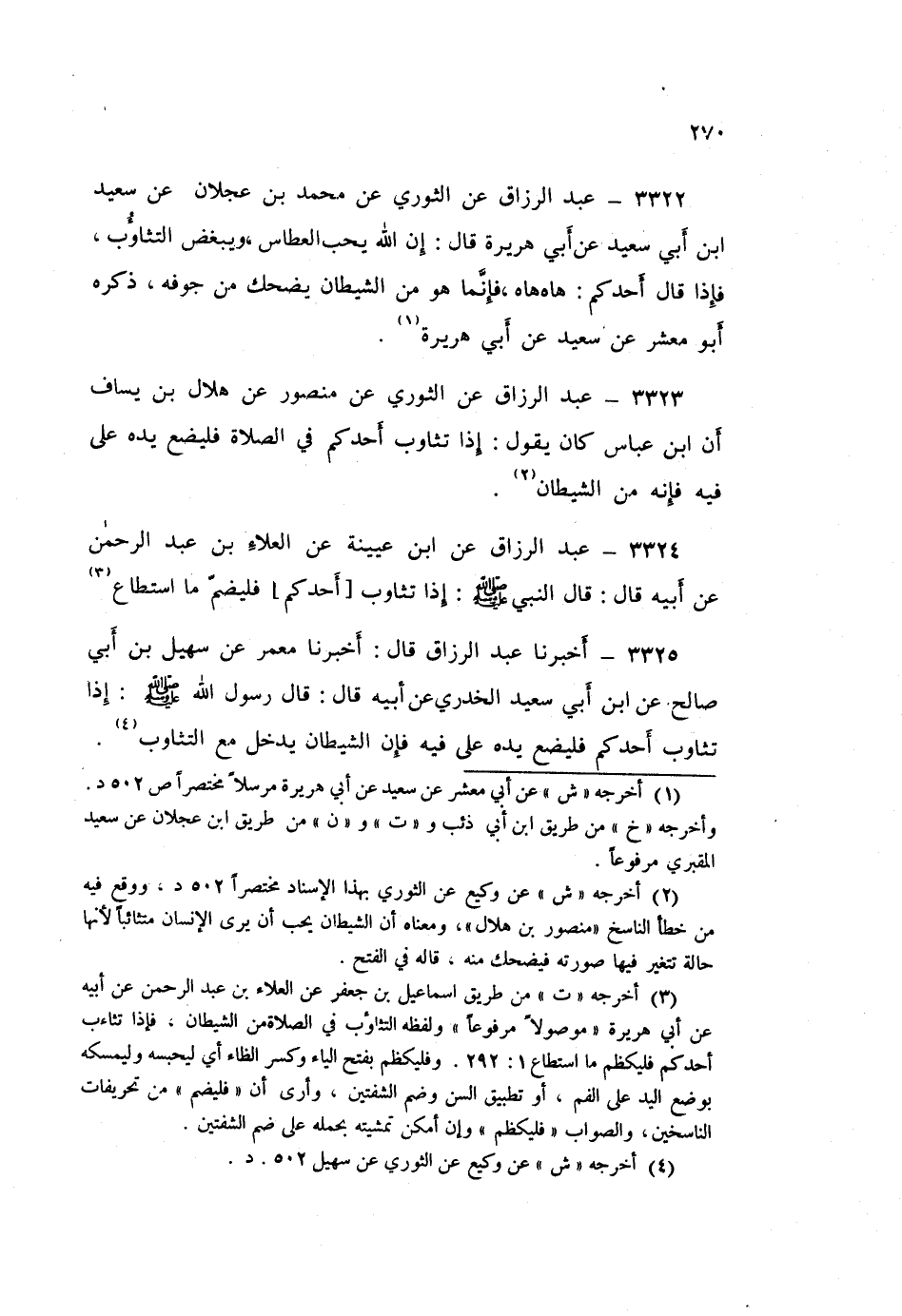 ٣٣٢٣ - عَنِ الثَّوْرِيِّ، عَنْ مَنْصُورٍ، عَنْ هِلَالِ بْنِ يَسَافٍ، أَنَّ ابْنَ عَبَّاسٍ كَانَ يَقُولُ: «إِذَا تَثَاوَبَ أَحَدُكُمْ فِي الصَّلَاةِ فَلْيَضَعْ يَدَهُ عَلَى فِيهِ، فَإِنَّهُ مِنَ الشَّيْطَانِ»