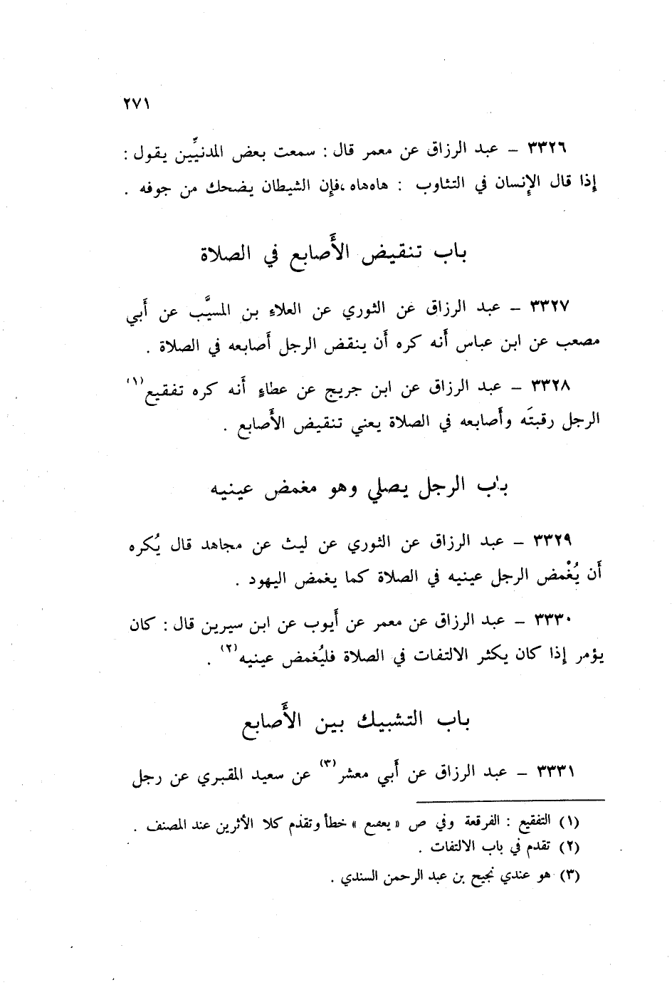 ٣٣٢٨ - عَنِ ابْنِ جُرَيْجٍ، عَنْ عَطَاءٍ «أَنَّهُ كَرِهَ تَفْقِيعَ الرَّجُلِ رَقَبَتَهُ وَأَصَابِعَهُ فِي الصَّلَاةِ» يَعْنِي تَنْقِيضَ الْأَصَابِعِ