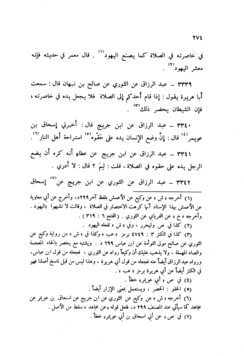 ٣٣٤٠ - عَنِ ابْنِ جُرَيْجٍ قَالَ: أَخْبَرَنِي إِسْحَاقُ بْنُ عُوَيْمِرٍ قَالَ: «إِنَّ وَضْعَ الْإِنْسَانِ يَدَهُ عَلَى حَقْوِهِ اسْتِرَاحَةُ أَهْلِ النَّارِ»
