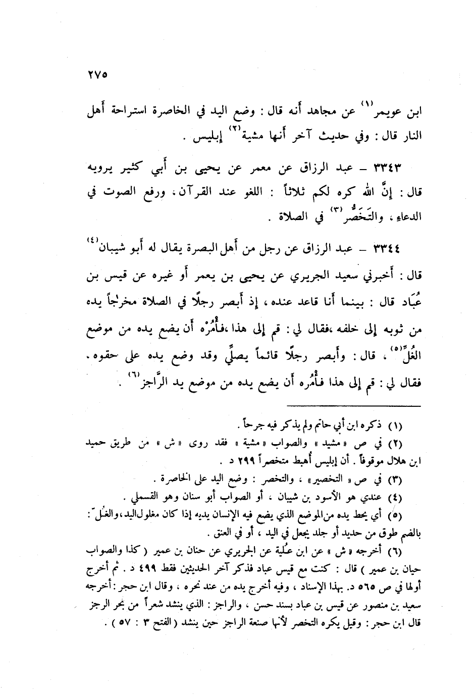 ٣٣٤٤ - عَنْ رَجُلٍ مِنْ أَهْلِ الْبَصْرَةِ يُقَالُ لَهُ أَبُو شَيْبَانَ قَالَ: أَخْبَرَنِي سَعِيدٌ الْجُرَيْرِيُّ، عَنْ يَحْيَى بْنِ يَعْمَرَ - أَوْ غَيْرِهِ - عَنْ قَيْسِ بْنِ عَبَّادٍ قَالَ: بَيْنَمَا أَنَا قَاعِدٌ عِنْدَهُ إِذْ أَبْصَرَ رَجُلًا فِي الصَّلَاةِ مُخْرِجًا يَدَهُ مِنْ ثَوْبِهِ إِلَى خَلْفِهِ، فَقَالَ لِي: «قُمْ إِلَى هَذَا، فَأْمُرْهُ أَنْ يَضَعَ يَدَهُ مِنْ مَوْضِعِ الْغُلِّ» قَالَ: وَأَبْصَرَ رَجُلًا قَائِمًا يُصَلِّي وَقَدْ وَضَعَ يَدَهُ عَلَى حَقْوِهِ، فَقَالَ لِي: «قُمْ إِلَى هَذَا فَأْمُرْهُ أَنْ يَضَعَ يَدَهُ مِنْ مَوْضِعِ يَدِ الرَّاجِزِ»
