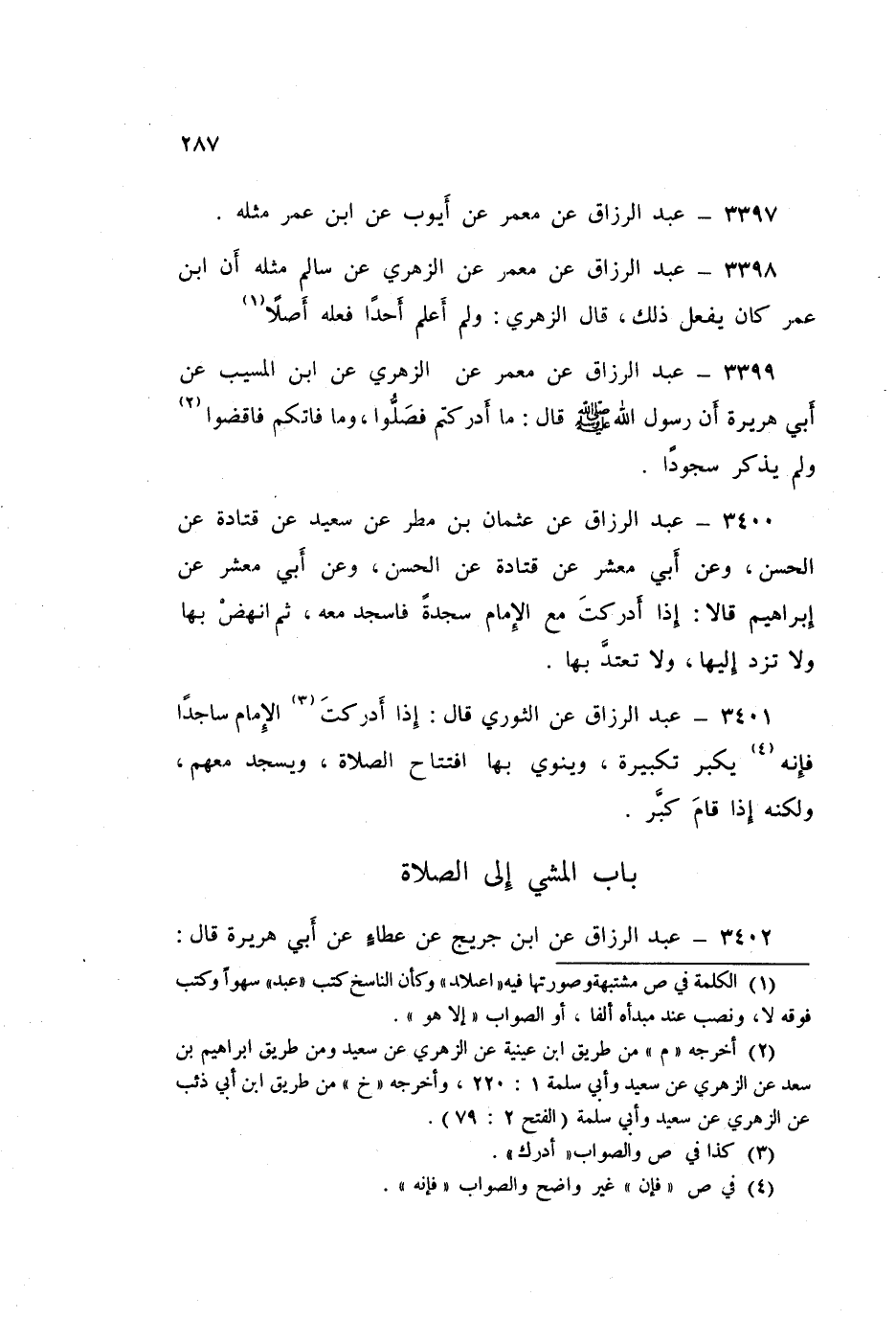 ٣٤٠٣ - عَنْ مَعْمَرٍ، عَنْ هَمَّامِ بْنِ مُنَبِّهٍ أَنَّهُ سَمِعَ أَبَا هُرَيْرَةَ يَقُولُ: قَالَ رَسُولُ اللَّهِ صَلَّى اللهُ عَلَيْهِ وَسَلَّمَ: «إِذَا نُودِيَ بِالصَّلَاةِ فَأْتُوهَا وَأَنْتُمْ تَمْشُونَ وَعَلَيْكُمُ السَّكِينَةُ، فَمَا أَدْرَكْتُمْ فَصَلُّوا، وَمَا فَاتَكُمْ فَأَتِمُّوا»
