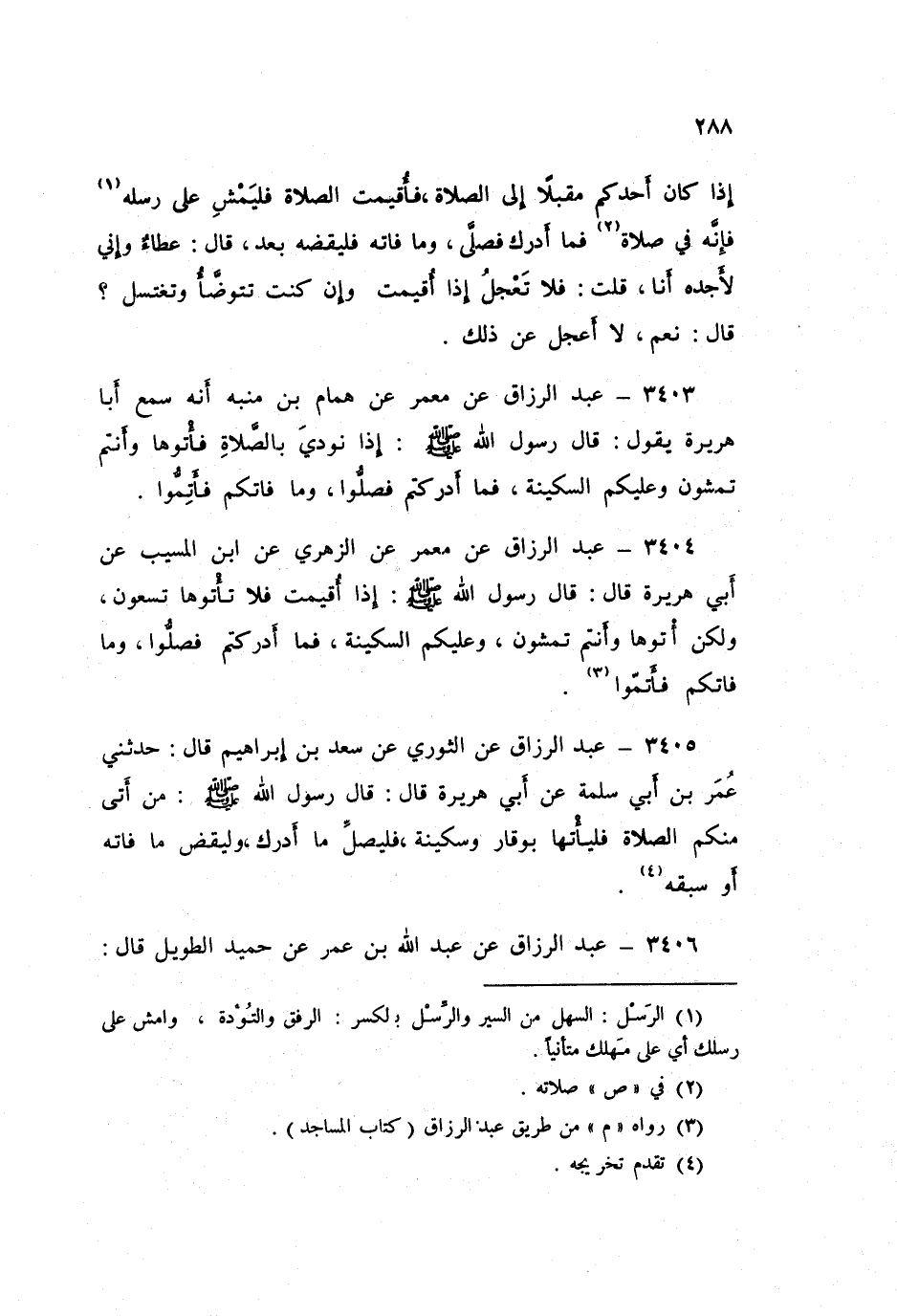 ٣٤٠٤ - عَنْ مَعْمَرٍ، عَنِ الزُّهْرِيِّ، عَنِ ابْنِ الْمُسَيَّبِ، عَنْ أَبِي هُرَيْرَةَ قَالَ: قَالَ رَسُولُ اللَّهِ صَلَّى اللهُ عَلَيْهِ وَسَلَّمَ: «إِذَا أُقِيمَتْ فَلَا تَأْتُوهَا تَسْعَوْنَ، وَلَكِنِ ائِتُوهَا وَأَنْتُمْ تَمْشُونَ، وَعَلَيْكُمُ السَّكِينَةُ، فَمَا أَدْرَكْتُمْ فَصَلُّوا، وَمَا فَاتَكُمْ فَأَتِمُّوا»