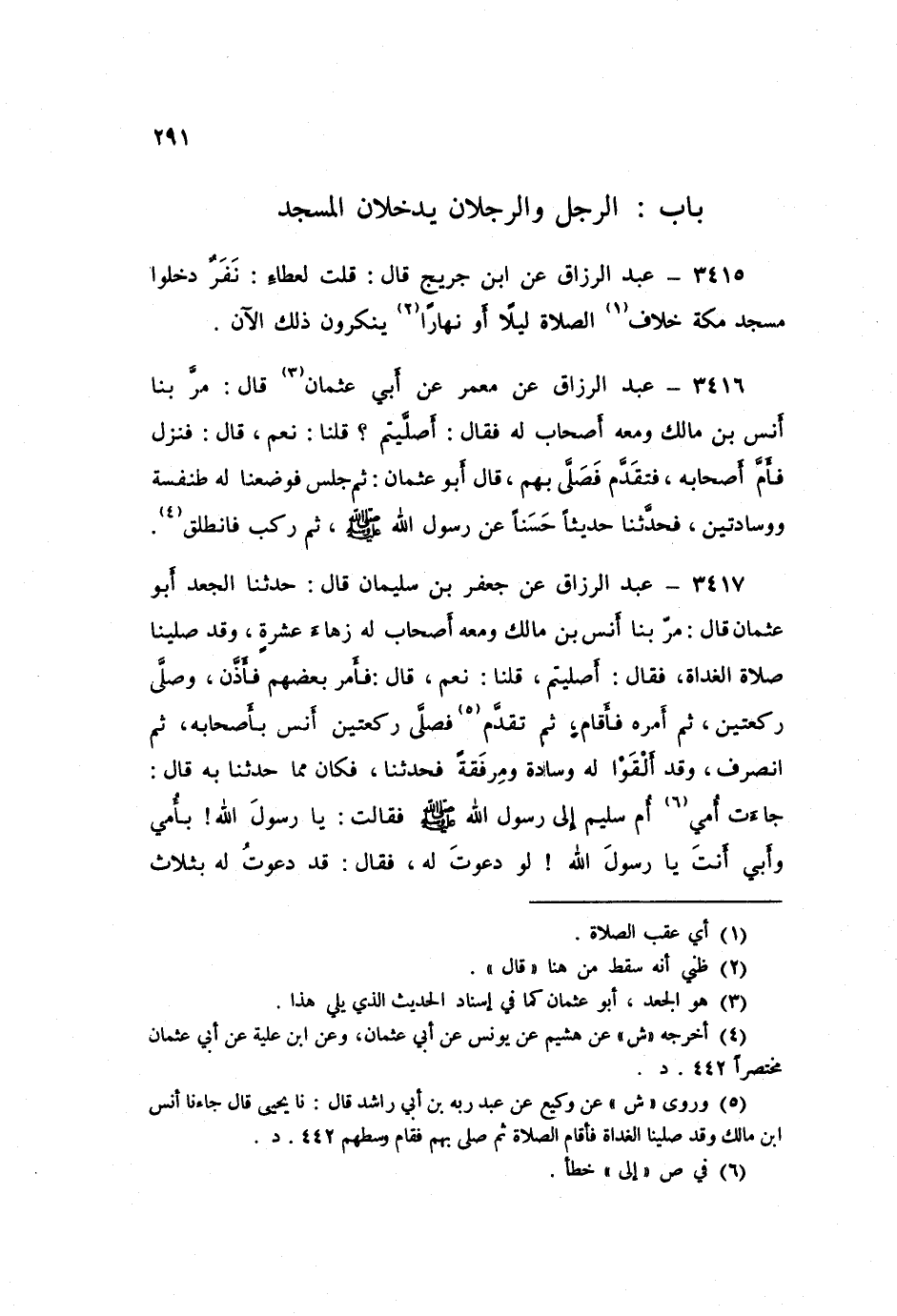 ٣٤١٦ - عَنْ مَعْمَرٍ، عَنْ أَبِي عُثْمَانَ قَالَ: مَرَّ بِنَا أَنَسُ بْنُ مَالِكٍ وَمَعَهُ أَصْحَابٌ لَهُ فَقَالَ: «أَصَلَّيْتُمْ؟» قُلْنَا: نَعَمْ قَالَ: فَنَزَلَ فَأَمَّ أَصْحَابَهُ، فَتَقَدَّمَ فَصَلَّى بِهِمْ، قَالَ أَبُو عُثْمَانَ: ثُمَّ جَلَسَ فَوَضَعْنَا لَهُ طِنْفِسَةً وَوِسَادَتَيْنِ، فَحَدَّثَنَا حَدِيثًا حَسَنًا عَنْ رَسُولِ اللَّهِ صَلَّى اللهُ عَلَيْهِ وَسَلَّمَ، ثُمَّ رَكِبَ فَانْطَلَقَ
