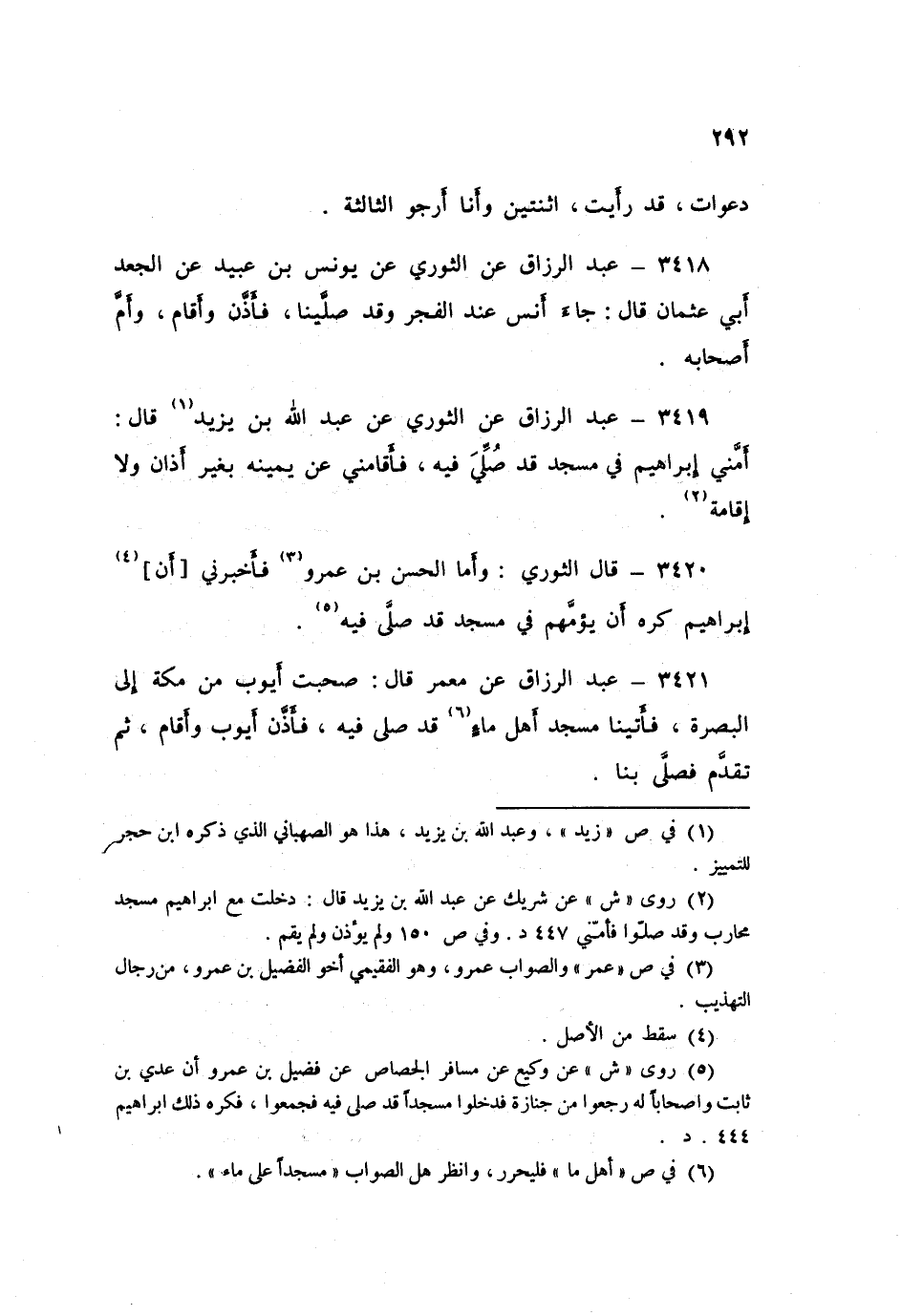 ٣٤٢١ - عَنْ مَعْمَرٍ قَالَ: «صَحِبْتُ أَيُّوبَ مِنْ مَكَّةَ إِلَى الْبَصْرَةِ، فَأَتَيْنَا مَسْجِدَ أَهْلِ مَاءٍ قَدْ صَلَّى فِيهِ، فَأَذَّنَ أَيُّوبُ وَأَقَامَ، ثُمَّ تَقَدَّمَ فَصَلَّى بِنَا»