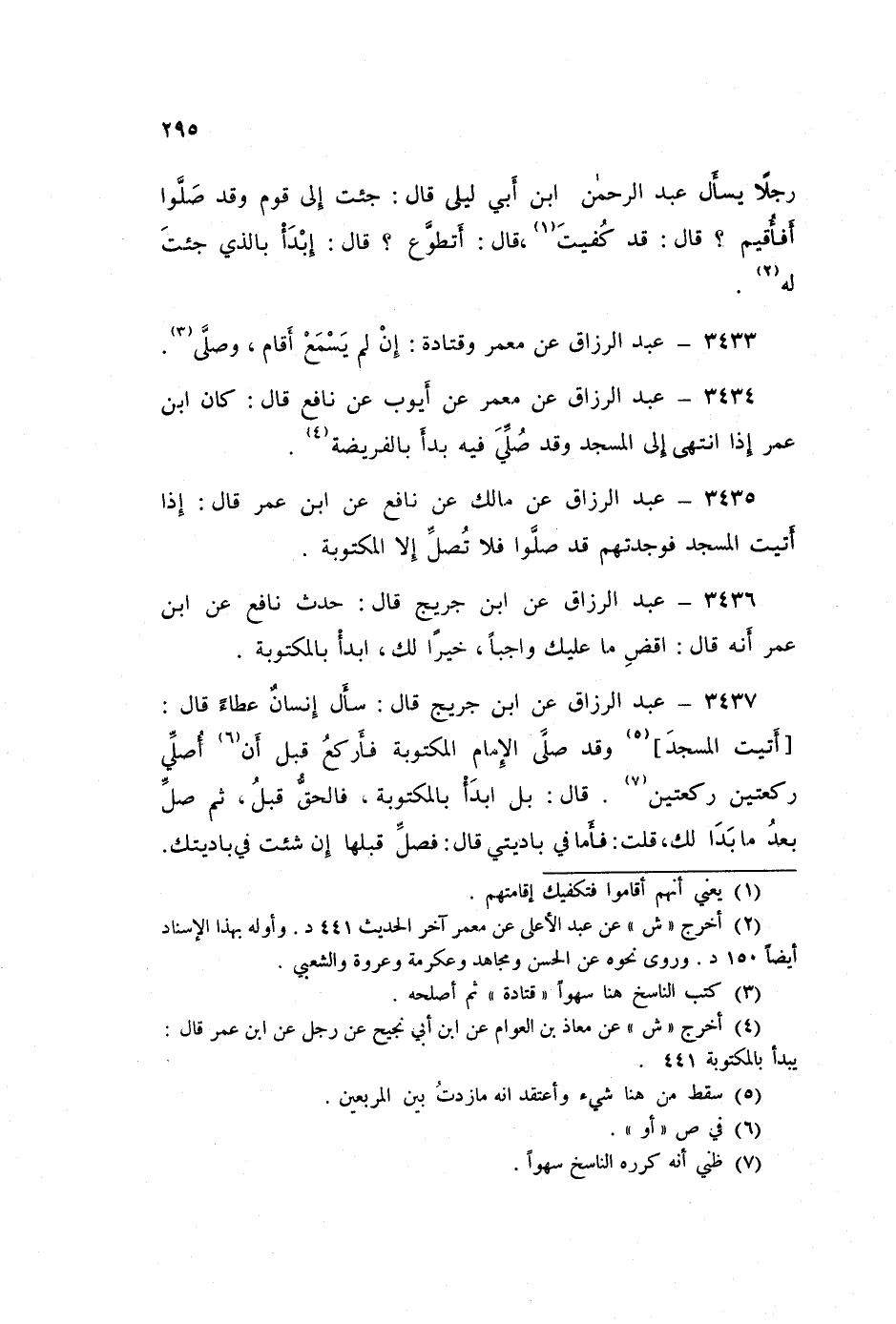 ٣٤٣٧ - عَنِ ابْنِ جُرَيْجٍ قَالَ: سَأَلَ إِنْسَانٌ عَطَاءً قَالَ: أَتَيْتُ الْمَسْجِدَ وَقَدْ صَلَّى الْإِمَامُ الْمَكْتُوبَةَ فَأَرْكَعُ قَبْلَ أَنْ أُصَلِّيَ رَكْعَتَيْنِ رَكْعَتَيْنِ؟ قَالَ: «بَلِ ابْدَأْ بِالْمَكْتُوبَةِ، فَالْحَقُّ قَبْلُ، ثُمَّ صَلِّ بَعْدُ مَا بَدَا لَكَ»، قُلْتُ: فَأَمَّا فِي بَادِيَتِي؟ قَالَ: «فَصَلِّ قَبْلَهَا إِنْ شِئْتَ فِي بَادِيَتِكَ»