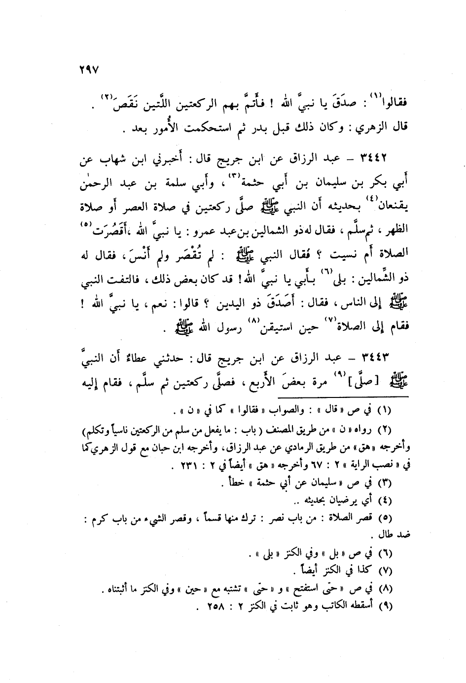 ٣٤٤٤ - عَنِ ابْنِ جُرَيْجٍ قَالَ: أَخْبَرَنِي عَبْدُ اللَّهِ بْنِ عُبَيْدِ اللَّهِ بْنِ أَبِي مُلَيْكَةَ أَنَّهُ سَمِعَ عُبَيْدَ بْنَ عُمَيْرٍ يَقُصُّ هَذَا الْخَبَرَ قَالَ: صَلَّى النَّبِيُّ صَلَّى اللهُ عَلَيْهِ وَسَلَّمَ الْعَصْرَ رَكْعَتَيْنِ، ثُمَّ سَلَّمَ وَانْصَرَفَ إِلَى أَهْلِهِ قُلْتُ: وَوَلَّى؟ قَالَ: وَوَلَّى، فَأَدْرَكَهُ ذُو الْيَدَيْنِ - أَخُو بَنِي سُلَيْمٍ - قَالَ: يَا نَبِيَّ اللَّهِ، أَنَسِيتَ أَمْ خَفَّفْتَ عَنَّا الصَّلَاةَ؟ قَالَ: «وَمَا ذَاكَ؟» قَالَ: صَلَّيْتَ الْعَصْرَ رَكْعَتَيْنِ قَالَ: «أَصَدَقَ ذُو الْيَدَيْنِ أَخُو بَنِي سُلَيْمٍ؟» قَالَ النَّاسُ: نَعَمْ، قَالَ النَّبِيُّ صَلَّى اللهُ عَلَيْهِ وَسَلَّمَ: «حَيَّ عَلَى الْفَلَاحِ، حَيَّ عَلَى الْفَلَاحِ»، قَدْ قَامَتِ الصَّلَاةُ، ثُمَّ صَلَّى بِهِمْ رَكْعَتَيْنِ، ثُمَّ انْصَرَفَ