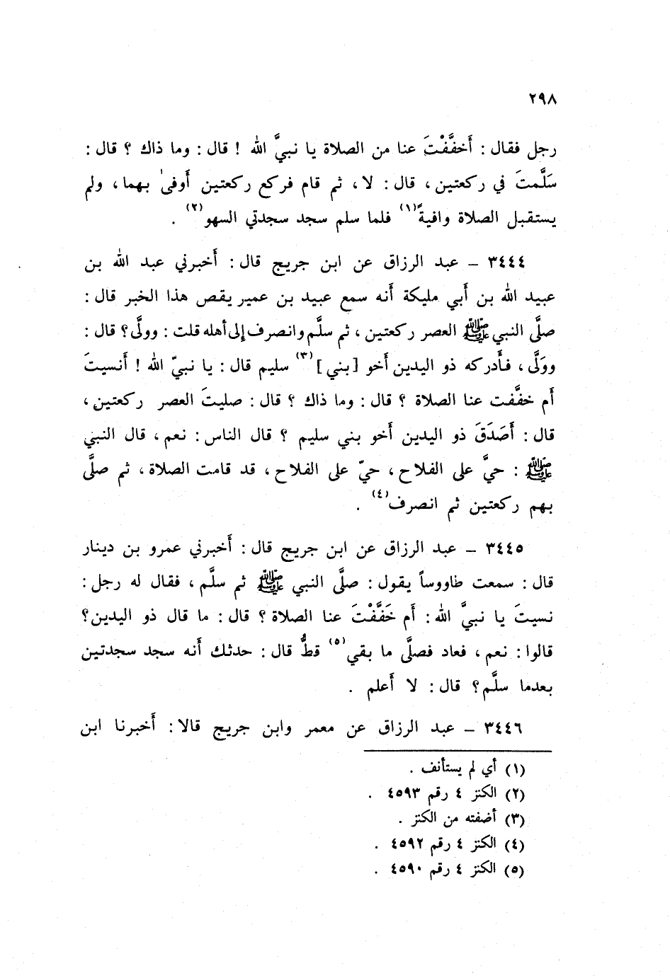 ٣٤٤٦ - عَبْدُ الرَّزَّاقِ، عَنْ مَعْمَرٍ، وَابْنِ جُرَيْجٍ قَالَا: أَخْبَرَنَا ابْنُ طَاوُسٍ، عَنْ أَبِيهِ أَنَّ النَّبِيَّ صَلَّى اللهُ عَلَيْهِ وَسَلَّمَ صَلَّى بَعْضَ الْأَرْبَعِ فَسَلَّمَ فِي سَجْدَتَيْنِ، فَقَالَ لَهُ ذُو الْيَدَيْنِ: أَنَسِيتَ أَمْ خَفَّفْتَ عَنَّا يَا نَبِيَّ اللَّهِ؟ قَالَ: «أَوَ فَعَلْتُ؟» قَالُوا: نَعَمْ، فَعَادَ فَصَلَّى رَكْعَتَيْنِ ثُمَّ سَجَدَ سَجْدَتَيْنِ وَهُوَ جَالِسٌ