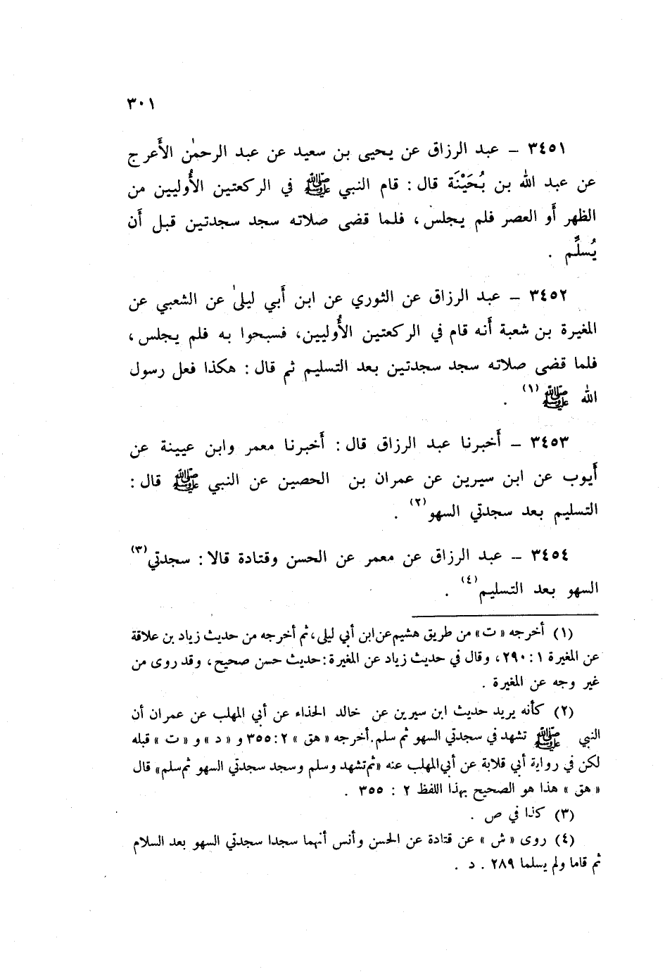 ٣٤٥٣ - عَبْدُ الرَّزَّاقِ، أَخْبَرَنَا مَعْمَرٌ، وَابْنُ عُيَيْنَةَ، عَنْ أَيُّوبَ، عَنِ ابْنِ سِيرِينَ، عَنْ عِمْرَانَ بْنِ الْحُصَيْنِ، عَنِ النَّبِيِّ صَلَّى اللهُ عَلَيْهِ وَسَلَّمَ قَالَ: «التَّسْلِيمُ بَعْدَ سَجْدَتَيِ السَّهْوِ»