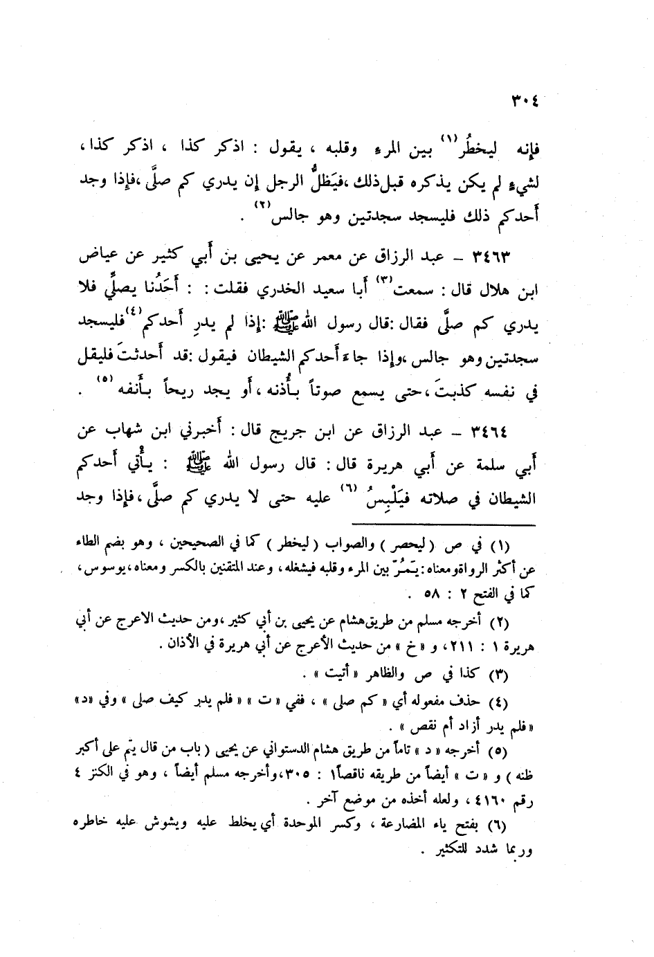 ٣٤٦٤ - عَنِ ابْنِ جُرَيْجٍ قَالَ: أَخْبَرَنِي ابْنُ شِهَابٍ، عَنْ أَبِي سَلَمَةَ، عَنْ أَبِي هُرَيْرَةَ قَالَ: قَالَ رَسُولُ اللَّهِ صَلَّى اللهُ عَلَيْهِ وَسَلَّمَ: «يَأْتِي أَحَدَكُمُ الشَّيْطَانُ فِي صَلَاتِهِ فَيَلْبِسُ عَلَيْهِ حَتَّى لَا يَدْرِي كَمْ صَلَّى، فَإِذَا وَجَدَ ذَلِكَ فَلْيَسْجُدْ سَجْدَتَيْنِ وَهُوَ جَالِسٌ»