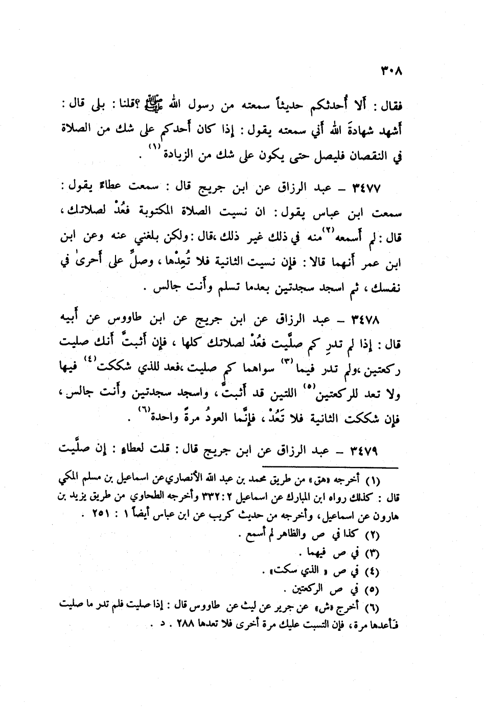 ٣٤٧٩ - عَنِ ابْنِ جُرَيْجٍ قَالَ: قُلْتُ لِعَطَاءٍ: إِنْ صَلَّيْتُ الْمَكْتُوبَةَ فَشَكَكْتُ عُدْتُ ثُمَّ شَكَكْتُ؟ قَالَ: «فَلَا تَعُدْ» قَالَ: فَقُلْتُ: إِنِّي اسْتَيْقَنْتُ أَنِّي صَلَّيْتُ خَمْسَ رَكَعَاتٍ قَالَ: «فَلَا تَعُدْ وَإِنْ صَلَّيْتَ عَشَرَ رَكَعَاتٍ، فَاسْجُدْ سَجْدَتَيِ السَّهْوِ»
