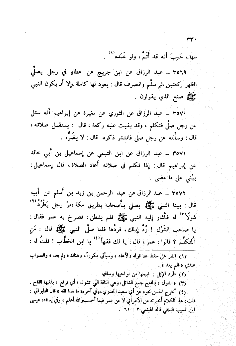 ٣٥٧٢ - عَنْ عَبْدِ الرَّحْمَنِ بْنِ زَيْدِ بْنِ أَسْلَمَ، عَنْ أَبِيهِ قَالَ: بَيْنَا النَّبِيُّ صَلَّى اللهُ عَلَيْهِ وَسَلَّمَ يُصَلِّي بِأَصْحَابِهِ بِطَرِيقِ مَكَّةَ، مَرَّ رَجُلٌ يَطْرُدُ شَوْلًا لَهُ، فَأَشَارَ إِلَيْهِ النَّبِيُّ صَلَّى اللهُ عَلَيْهِ وَسَلَّمَ فَلَمْ يَفْطِنْ، فَصَرَخَ بِهِ عُمَرُ، فَقَالَ: يَا صَاحِبَ الشَّوْلِ رُدَّ إِبِلَكَ، فَرَدَّهَا، فَلَمَّا صَلَّى النَّبِيُّ صَلَّى اللهُ عَلَيْهِ وَسَلَّمَ قَالَ: «مَنِ الْمُتَكَلِّمُ؟» قَالُوا: عُمَرُ قَالَ: «يَا لَكَ فِقْهًا يَا ابْنَ الْخَطَّابِ»، قُلْتُ لَهُ: مَا الشَّوْلُ؟ قَالَ: فِرْقَةٌ مِنَ الْإِبِلِ