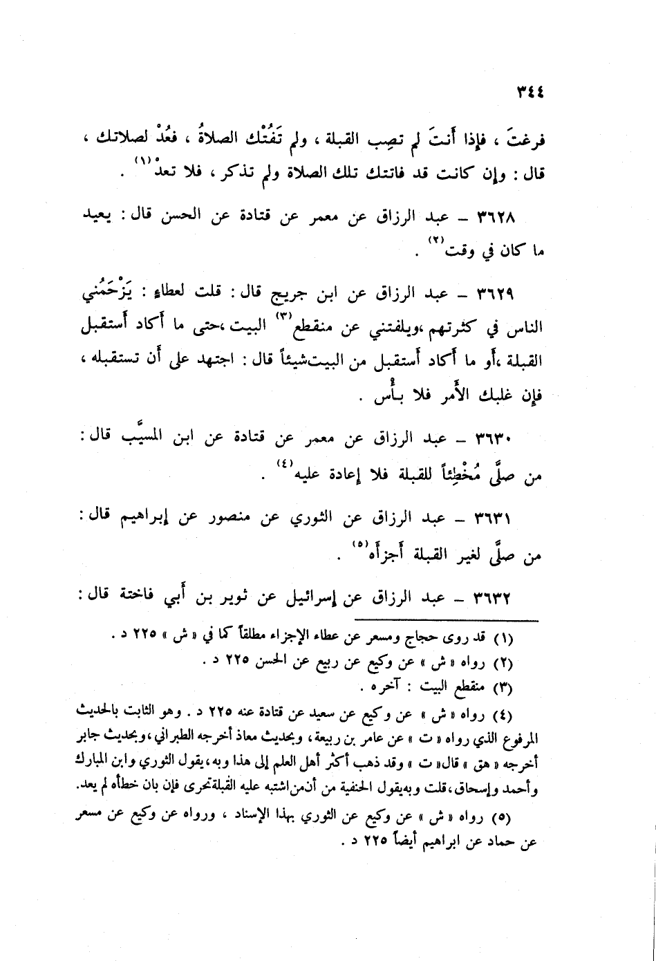 ٣٦٣٠ - عَنْ مَعْمَرٍ، عَنْ قَتَادَةَ، عَنِ ابْنِ الْمُسَيَّبِ قَالَ: «مَنْ صَلَّى مُخْطِئًا لِلْقِبْلَةِ فَلَا إِعَادَةَ عَلَيْهِ»