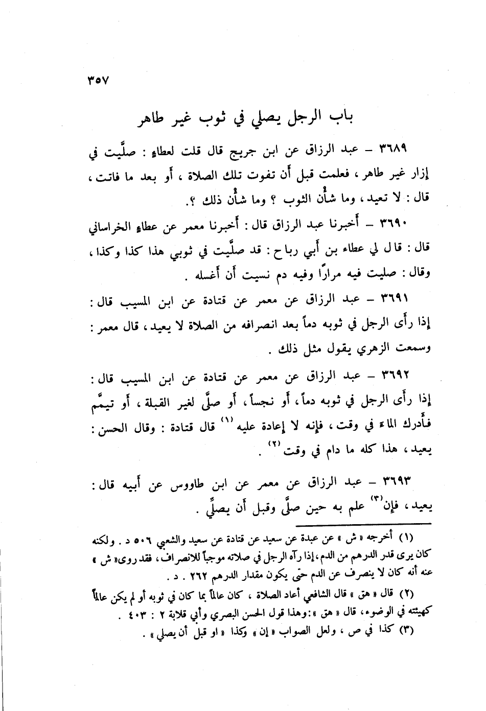٣٦٩٠ - عَبْدُ الرَّزَّاقِ، أَخْبَرَنَا مَعْمَرٌ، عَنْ عَطَاءٍ الْخَرَاسَانِيِّ قَالَ: قَالَ لِي عَطَاءُ بْنُ أَبِي رَبَاحٍ: «قَدْ صَلَّيْتُ فِي ثَوْبِي هَذَا كَذَا وَكَذَا»؟ وَقَالَ: «صَلَّيْتُ فِيهِ مِرَارًا وَفِيهِ دَمٌ نَسِيتُ أَنْ أَغْسِلَهُ»