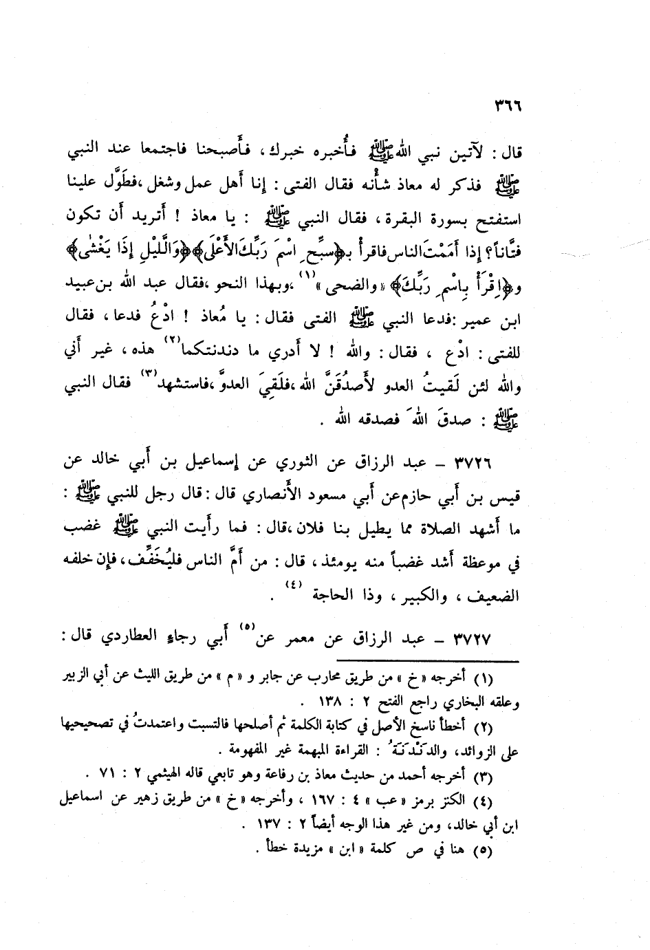 ٣٧٢٦ - عَنِ الثَّوْرِيِّ، عَنْ إِسْمَاعِيلَ بْنِ أَبِي خَالِدٍ، عَنْ قَيْسِ بْنِ أَبِي حَازِمٍ، عَنْ أَبِي مَسْعُودٍ الْأَنْصَارِيِّ قَالَ: قَالَ رَجُلٌ لِلنَّبِيِّ صَلَّى اللهُ عَلَيْهِ وَسَلَّمَ: مَا أَشْهَدُ الصَّلَاةَ مِمَّا يُطِيلُ بِنَا فُلَانٌ قَالَ: فَمَا رَأَيْتُ النَّبِيَّ صَلَّى اللهُ عَلَيْهِ وَسَلَّمَ غَضِبَ فِي مَوْعِظَةٍ أَشَدَّ غَضَبًا مِنْهُ يَوْمَئِذٍ قَالَ: «مَنْ أَمَّ النَّاسَ فَلْيُخَفِّفْ، فَإِنَّ خَلْفَهُ الضَّعِيفَ، وَالْكَبِيرَ، وَذَا الْحَاجَةِ»