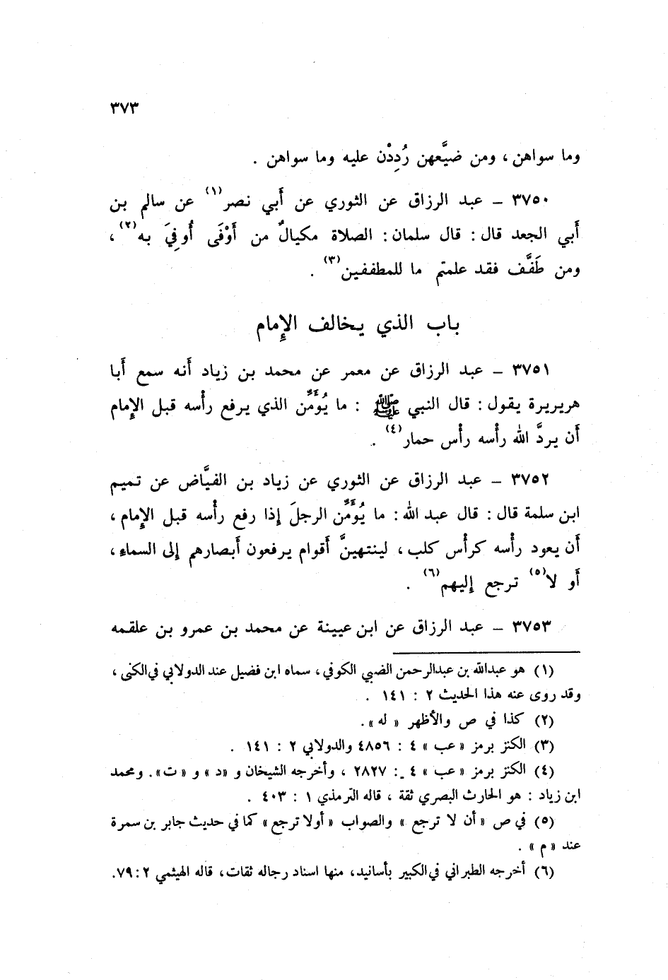٣٧٥٢ - عَنِ الثَّوْرِيِّ، عَنْ زِيَادِ بْنِ " الْفَيَّاضِ، عَنْ تَمِيمِ بْنِ سَلَمَةَ قَالَ: قَالَ عَبْدُ اللَّهِ: «مَا يُؤَمِّنُ الرَّجُلُ إِذَا رَفَعَ رَأْسَهُ قَبْلَ الْإِمَامِ أَنْ يَعُودَ رَأْسُهُ كَرَأْسِ كَلْبٍ، لَيَنْتَهِيَنَّ أَقْوَامٌ يَرْفَعُونَ أَبْصَارَهُمْ إِلَى السَّمَاءِ، أَوْ لَا تَرْجِعُ إِلَيْهِمْ»