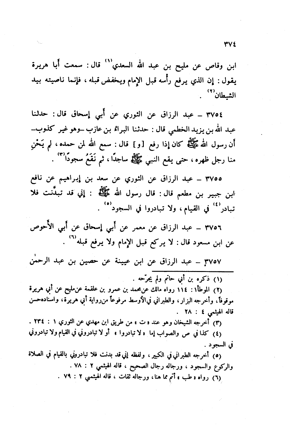 ٣٧٥٧ - عَنِ ابْنِ عُيَيْنَةَ، عَنْ حُصَيْنِ بْنِ عَبْدِ الرَّحْمَنِ، عَنْ هِلَالِ بْنِ يَسَافٍ، عَنْ سُحَيْمِ بْنِ نَوْفَلٍ قَالَ: قَالَ ابْنُ مَسْعُودٍ: «لَا تُبَادِرُوا أَئِمَّتَكُمْ بِالرُّكُوعِ وَلَا بِالسُّجُودِ، فَإِنْ سَبَقَ أَحَدٌ مِنْكُمْ فَلْيَضَعْ قَدْرَ مَا يَسْبِقُ بِهِ»