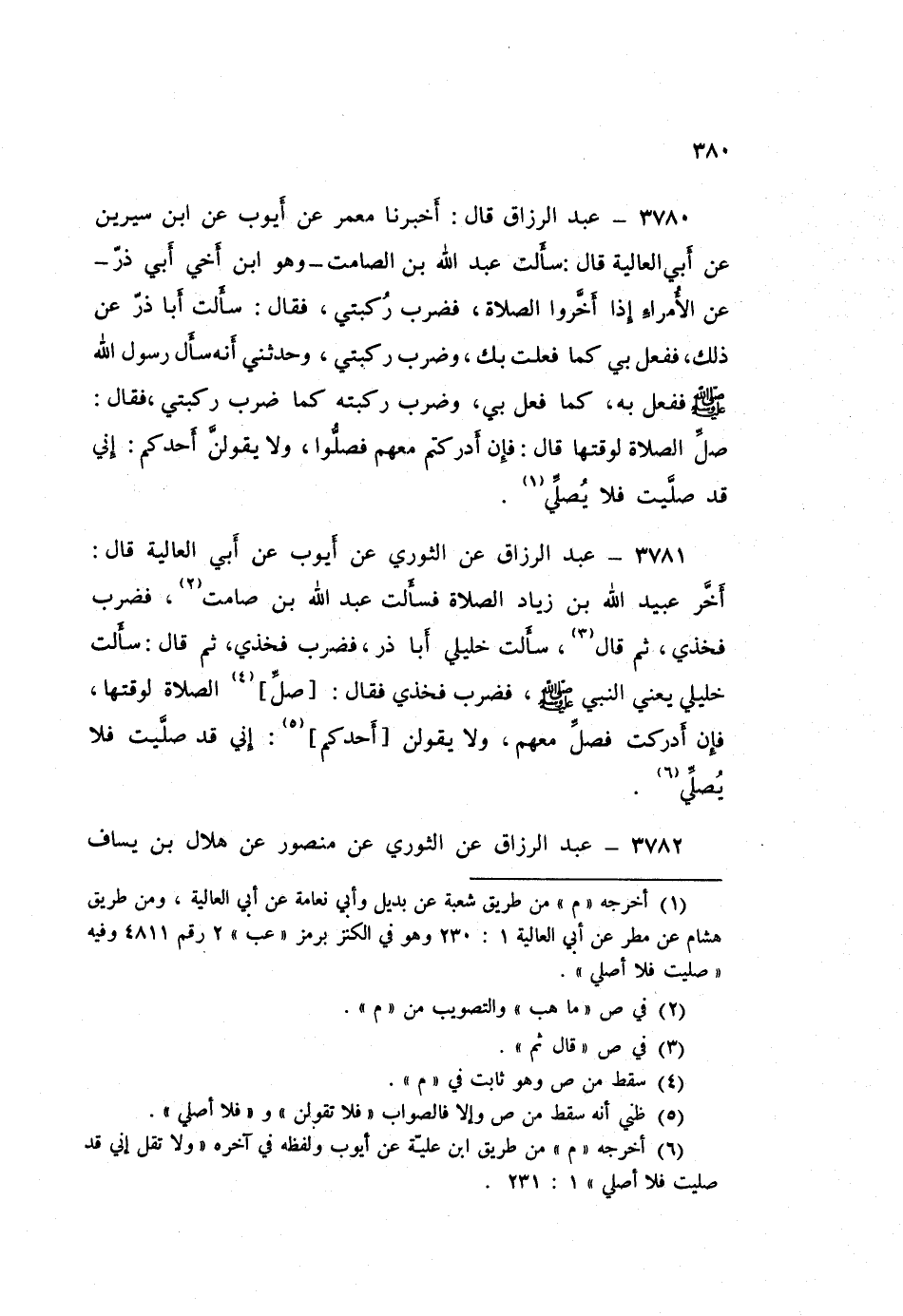 ٣٧٨٠ - عَبْدُ الرَّزَّاقِ، أَخْبَرَنَا مَعْمَرٌ، عَنْ أَيُّوبَ، عَنِ ابْنِ سِيرِينَ، عَنْ أَبِي الْعَالِيَةِ قَالَ: سَأَلْتُ عَبْدَ اللَّهِ بْنَ الصَّامِتِ، وَهُوَ ابْنُ أَخِي أَبِي ذَرٍّ، عَنِ الْأُمَرَاءِ إِذَا أَخَّرُوا الصَّلَاةَ، فَضَرَبَ رُكْبَتِي، فَقَالَ: سَأَلْتُ أَبَا ذَرٍّ عَنْ ذَلِكَ، فَفَعَلَ بِي كَمَا فَعَلْتُ بِكَ، وَضَرَبَ رُكْبَتِي، وَحَدَّثَنِي أَنَّهُ سَأَلَ رَسُولَ اللَّهِ صَلَّى اللهُ عَلَيْهِ وَسَلَّمَ فَفَعَلَ بِهِ كَمَا فَعَلَ بِي، وَضَرَبَ رُكْبَتَهِ كَمَا ضَرَبَ رُكْبَتِي، فَقَالَ: «صَلِّ الصَّلَاةَ لِوَقْتِهَا» قَالَ: «فَإِنْ أَدْرَكْتُمْ مَعَهُمْ فَصَلُّوا، وَلَا يَقُولَنَّ أَحَدُكُمْ إِنِّي قَدْ صَلَّيْتُ فَلَا يُصَلِّي»