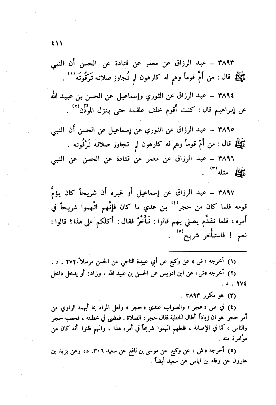 ٣٨٩٥ - عَنِ الثَّوْرِيِّ، عَنْ إِسْمَاعِيلَ، عَنِ الْحَسَنِ، أَنَّ النَّبِيَّ صَلَّى اللهُ عَلَيْهِ وَسَلَّمَ قَالَ: «مَنْ أَمَّ قَوْمًا، وَهُمْ لَهُ كَارِهُونَ لَمْ تُجَاوِزْ صَلَاتُهُ تَرْقُوَتَهُ» عَبْدُ الرَّزَّاقِ،
