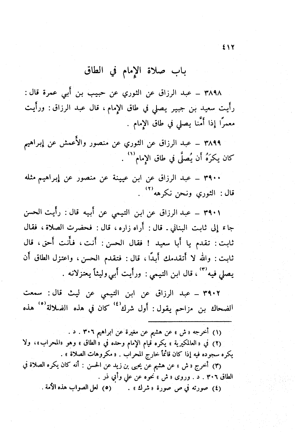 ٣٨٩٩ - عَنِ الثَّوْرِيِّ، عَنْ مَنْصُورٍ، وَالْأَعْمَشِ، عَنْ إِبْرَاهِيمَ: «كَانَ يَكْرَهُ أَنْ يُصَلِّيَ فِي طَاقِ الْإِمَامِ» عَبْدُ الرَّزَّاقِ،