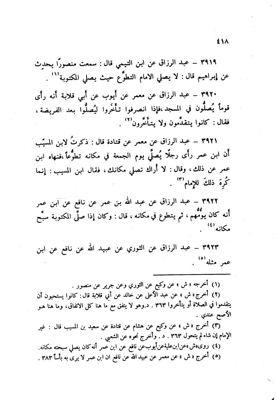٣٩٢٢ - عَنْ عَبْدِ اللَّهِ بْنِ عُمَرَ، عَنْ نَافِعٍ، عَنِ ابْنِ عُمَرَ: أَنَّهُ كَانَ يَؤُمُّهُمْ، ثُمَّ يَتَطَوَّعُ فِي مَكَانَهِ قَالَ: «وَكَانَ إِذَا صَلَّى الْمَكْتُوبَةَ سَبَّحَ مَكَانَهُ» عَبْدُ الرَّزَّاقِ،،