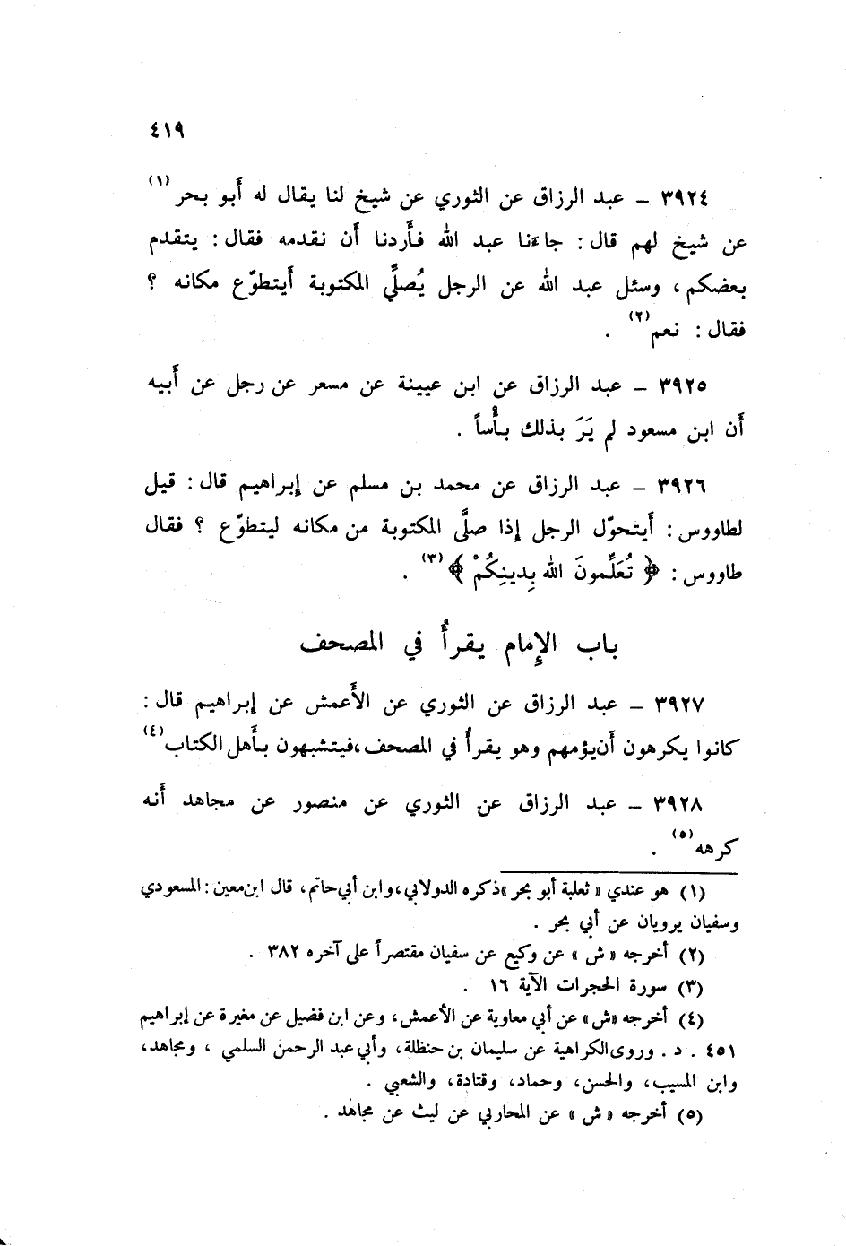 ٣٩٢٧ - عَنِ الثَّوْرِيِّ، عَنِ الْأَعْمَشِ، عَنْ إِبْرَاهِيمَ قَالَ: «كَانُوا يَكْرَهُونَ أَنْ يَؤُمَّهُمْ، وَهُوَ يَقْرَأُ فِي الْمُصْحَفِ، فَيَتَشَبَّهُونَ بِأَهْلِ الْكِتَابِ»