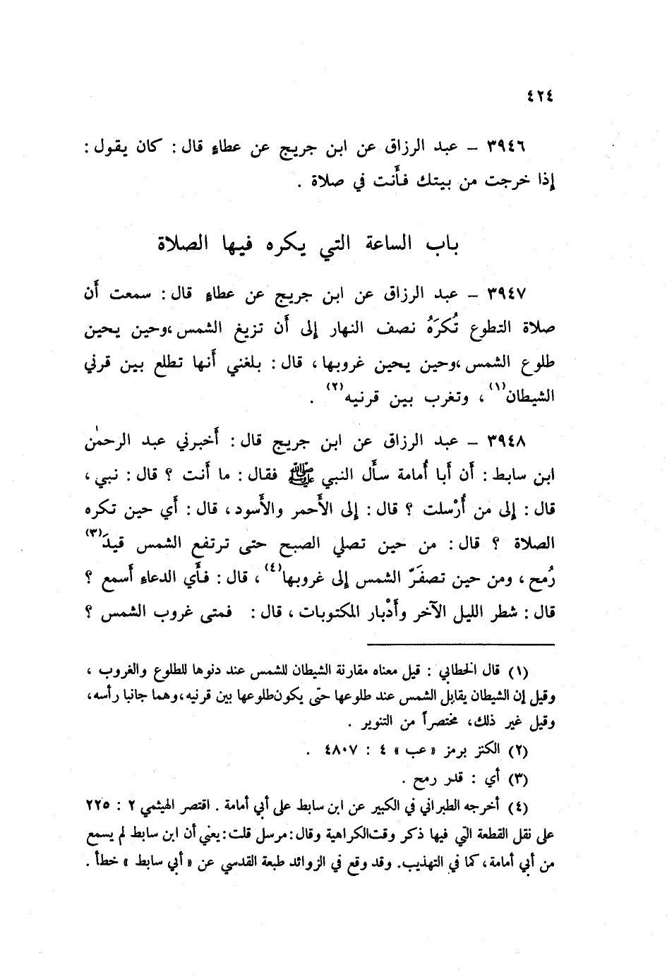 ٣٩٤٨ - عَنِ ابْنِ جُرَيْجٍ قَالَ: أَخْبَرَنِي عَبْدُ الرَّحْمَنِ بْنُ سَابِطٍ، أَنَّ أَبَا أُمَامَةَ، سَأَلَ النَّبِيَّ صَلَّى اللهُ عَلَيْهِ وَسَلَّمَ، فَقَالَ: مَا أَنْتَ؟ قَالَ: «نَبِيٌّ» قَالَ: إِلَى مَنْ أُرْسِلْتَ؟ قَالَ: «إِلَى الْأَحْمَرِ وَالْأَسْوَدِ» قَالَ: أَيَّ حِينٍ تُكْرَهُ الصَّلَاةُ؟ قَالَ: «مِنْ حِينِ تُصَلِّي الصُّبْحَ حَتَّى تَرْتَفِعَ الشَّمْسُ قِيدَ رُمْحٍ، وَمَنْ حِينِ تَصْفَرُّ الشَّمْسُ إِلَى غُرُوبِهَا» قَالَ: فَأَيُّ الدُّعَاءِ أَسْمَعُ؟ قَالَ: «شَطْرُ اللَّيْلِ الْآخِرُ، وَأَدْبَارُ الْمَكْتُوبَاتِ» قَالَ: فَمَتَى غُرُوبُ الشَّمْسِ؟ قَالَ: «مِنْ أَوَّلِ مَا تَصْفَرُّ الشَّمْسُ حِينَ تَدْخُلُهَا صُفْرَةٌ إِلَى حِينِ أَنْ تَغْرُبَ الشَّمْسُ»