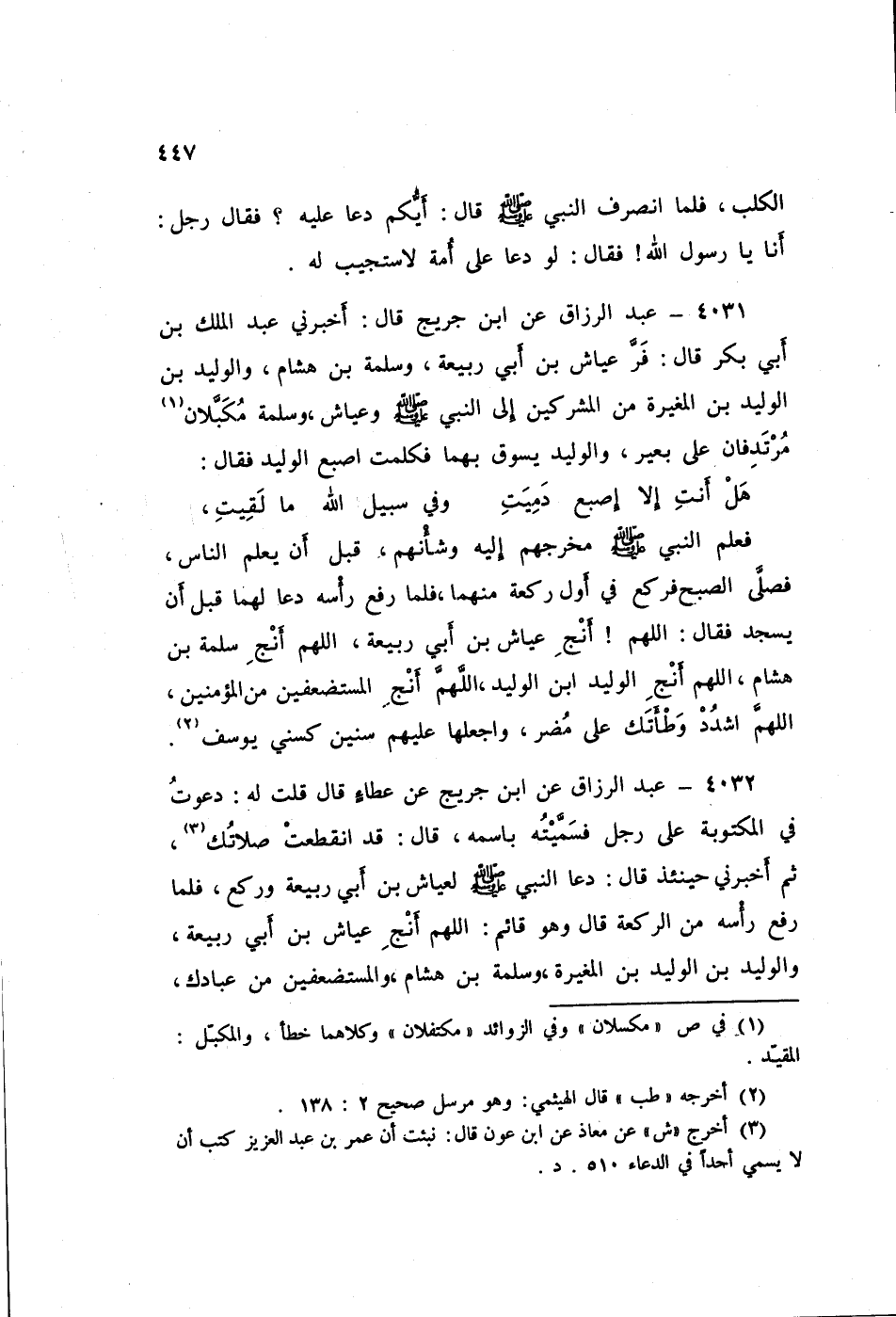 ٤٠٣٢ - عَنِ ابْنِ جُرَيْجٍ، عَنْ عَطَاءٍ قَالَ: قُلْتُ لَهُ: دَعَوْتُ فِي الْمَكْتُوبَةِ عَلَى رَجُلٍ فَسَمَّيْتُهُ بِاسْمِهِ قَالَ: قَدِ انْقَطَعَتْ صَلَاتُكَ، ثُمَّ أَخْبَرَنِي حِينَئِذٍ قَالَ: دَعَا النَّبِيُّ صَلَّى اللهُ عَلَيْهِ وَسَلَّمَ لِعَيَّاشِ بْنِ أَبِي رَبِيعَةَ وَرَكَعَ، فَلَمَّا رَفَعَ رَأْسَهُ مِنَ الرَّكْعَةِ، قَالَ وَهُوَ قَائِمٌ: «اللَّهُمَّ أَنْجِ عَيَّاشَ بْنَ أَبِي رَبِيعَةَ، وَالْوَلِيدَ بْنَ الْوَلِيدِ بْنِ الْمُغِيرَةِ، وَسَلَمَةَ بْنَ هِشَامٍ، وَالْمُسْتَضْعَفِينَ مِنْ عِبَادَكَ» ⦗٤٤٨⦘، قُلْتُ: فَدَعَا بِهَذَا وَسَمَّى مَا سَمَّى قَالَ: لَا أَدْرِي أَكَانَ فِي سُبْحَةٍ أَوْ مَكْتُوبَةٍ، قُلْتُ: أَرَأَيْتَ إِنْ كَانَ النَّبِيُّ صَلَّى اللهُ عَلَيْهِ وَسَلَّمَ دَعَا لَهُمْ فِي الْمَكْتُوبَةِ؟ قَالَ: لَا أَدْرِي، وَلَعَلَّهُ أُمِرَ بِذَلِكَ النَّبِيُّ صَلَّى اللهُ عَلَيْهِ وَسَلَّمَ، وَلَسْنَا كَهَيْئَتِهِ، قَالَ ابْنُ جُرَيْجٍ: قَالَ عَطَاءٌ: دَعَا لَهُمْ ثُمَّ لَمْ يَدْعُ بَعْدَ ذَلِكَ فِيمَا بَلَغَنِي