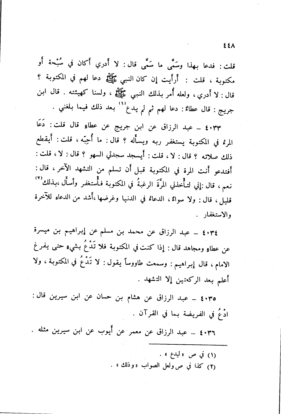 ٤٠٣٥ - عَنْ هِشَامِ بْنِ حَسَّانَ، عَنِ ابْنِ سِيرِينَ قَالَ: «ادْعُ فِي الْفَرِيضَةِ بِمَا فِي الْقُرْآنِ» عَبْدُ الرَّزَّاقِ،