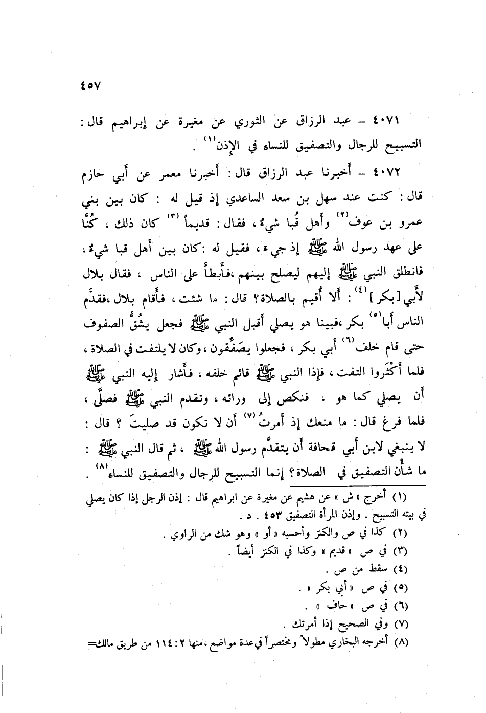 ٤٠٧٢ - عَبْدُ الرَّزَّاقِ، أَخْبَرَنَا مَعْمَرٌ، عَنْ أَبِي حَازِمٍ قَالَ: كُنْتُ عِنْدَ سَهْلِ بْنِ سَعْدٍ السَّاعِدِيِّ، إِذْ قِيلَ لَهُ: كَانَ بَيْنَ بَنِي عَمْرِو بْنِ عَوْفٍ وَأَهْلِ قُبَا شَيْءٌ، فَقَالَ: قَدِيمًا كَانَ ذَلِكَ، كُنَّا عَلَى عَهْدِ رَسُولِ اللَّهِ صَلَّى اللهُ عَلَيْهِ وَسَلَّمَ إِذْ جِيءَ، فَقِيلَ لَهُ: كَانَ بَيْنَ أَهْلِ قُبَا شَيْءٌ، فَانْطَلَقَ النَّبِيُّ صَلَّى اللهُ عَلَيْهِ وَسَلَّمَ إِلَيْهِمْ لِيُصْلِحَ بَيْنَهُمْ، فَأَبْطَأَ عَلَى النَّاسِ، فَقَالَ بِلَالٌ لِأَبِي بَكْرٍ: أَلَا أُقِيمُ بِالصَّلَاةِ؟ قَالَ: مَا شِئْتَ، فَأَقَامَ بِلَالٌ فَقَدَّمَ النَّاسُ أَبَا بَكْرٍ، فَبَيْنَا هُوَ يُصَلِّي أَقْبَلَ النَّبِيُّ صَلَّى اللهُ عَلَيْهِ وَسَلَّمَ، فَجَعَلَ يَشُقُّ الصُّفُوفَ حَتَّى قَامَ خَلْفَ أَبِي بَكْرٍ، فَجَعَلُوا يُصَفِّقُونَ، وَكَانَ لَا يَلْتَفِتُ فِي الصَّلَاةِ، فَلَمَّا أَكْثَرُوا الْتَفَتَ، فَإِذَا النَّبِيُّ صَلَّى اللهُ عَلَيْهِ وَسَلَّمَ قَائِمٌ خَلْفَهُ فَأَشَارَ إِلَيْهِ النَّبِيُّ صَلَّى اللهُ عَلَيْهِ وَسَلَّمَ أَنْ يُصَلِّيَ كَمَا هُوَ، فَنَكَصَ إِلَى وَرَائِهِ، وَتَقَدَّمَ النَّبِيُّ صَلَّى اللهُ عَلَيْهِ وَسَلَّمَ، فَصَلَّى فَلَمَّا فَرَغَ قَالَ: «مَا مَنَعَكَ إِذْ أُمِرْتُ أَنْ لَا تَكُونَ قَدْ صَلَّيْتَ؟» قَالَ: لَا يَنْبَغِي لِابْنِ أَبِي قُحَافَةَ أَنْ يَتَقَدَّمَ رَسُولَ اللَّهِ صَلَّى اللهُ عَلَيْهِ وَسَلَّمَ، ثُمَّ قَالَ النَّبِيُّ صَلَّى اللهُ عَلَيْهِ وَسَلَّمَ: «مَا شَأْنُ التَّصْفِيقِ فِي الصَّلَاةِ؟ إِنَّمَا التَّسْبِيحُ لِلرِّجَالِ وَالتَّصْفِيقُ لِلنِّسَاءِ»
