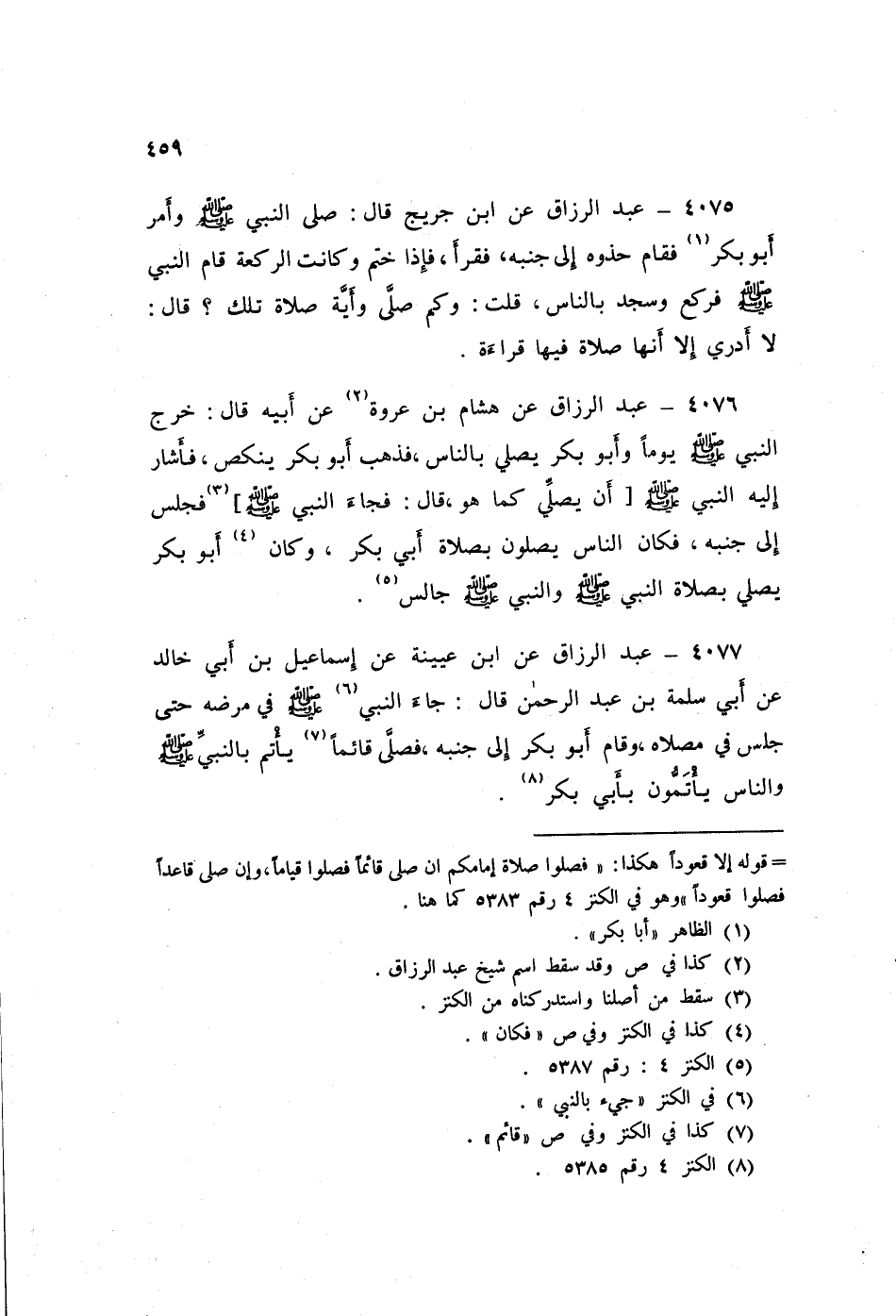 ٤٠٧٦ - عَنْ هِشَامِ بْنِ عُرْوَةَ، عَنْ أَبِيهِ قَالَ: «خَرَجَ النَّبِيُّ صَلَّى اللهُ عَلَيْهِ وَسَلَّمَ يَوْمًا وَأَبُو بَكْرٍ يُصَلِّي بِالنَّاسِ، فَذَهَبَ أَبُو بَكْرٍ يَنْكُصُ، فَأَشَارَ إِلَيْهِ النَّبِيُّ صَلَّى اللهُ عَلَيْهِ وَسَلَّمَ أَنْ يُصَلِّيَ كَمَا هُوَ» قَالَ: «فَجَاءَ النَّبِيُّ صَلَّى اللهُ عَلَيْهِ وَسَلَّمَ فَجَلَسَ إِلَى جَنْبِهِ، فَكَانَ النَّاسُ يُصَلُّونَ بِصَلَاةِ أَبِي بَكْرٍ، وَكَانَ أَبُو بَكْرٍ يُصَلِّي بِصَلَاةِ النَّبِيِّ صَلَّى اللهُ عَلَيْهِ وَسَلَّمَ، وَالنَّبِيُّ صَلَّى اللهُ عَلَيْهِ وَسَلَّمَ جَالِسٌ»