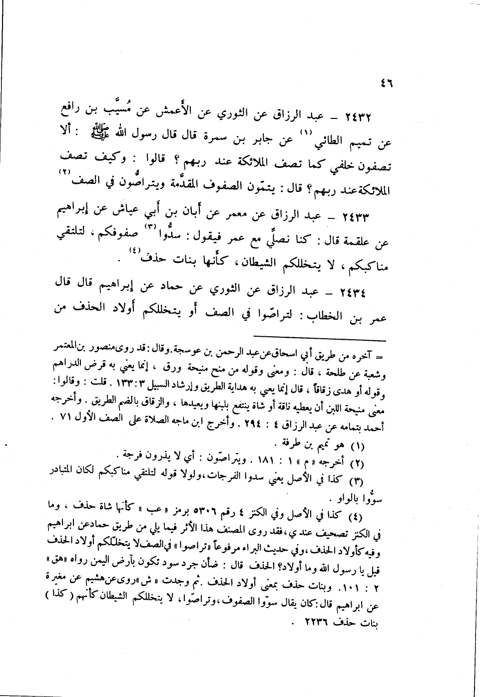 ٢٤٣٤ - عَنِ الثَّوْرِيِّ، عَنْ حَمَّادٍ، عَنْ إِبْرَاهِيمَ قَالَ: قَالَ عُمَرُ بْنُ الْخَطَّابِ: «لِتَرَاصَّوْا فِي الصَّفِّ، أَوْ يَتَخَلَّلُكُمْ أَوْلَادُ الْحَذَفِ مِنَ الشَّيْطَانِ، فَإِنَّ اللَّهَ وَمَلَائِكَتَهُ يُصَلُّونَ عَلَى الَّذِينَ يُقِيمُونَ الصُّفُوفَ»
